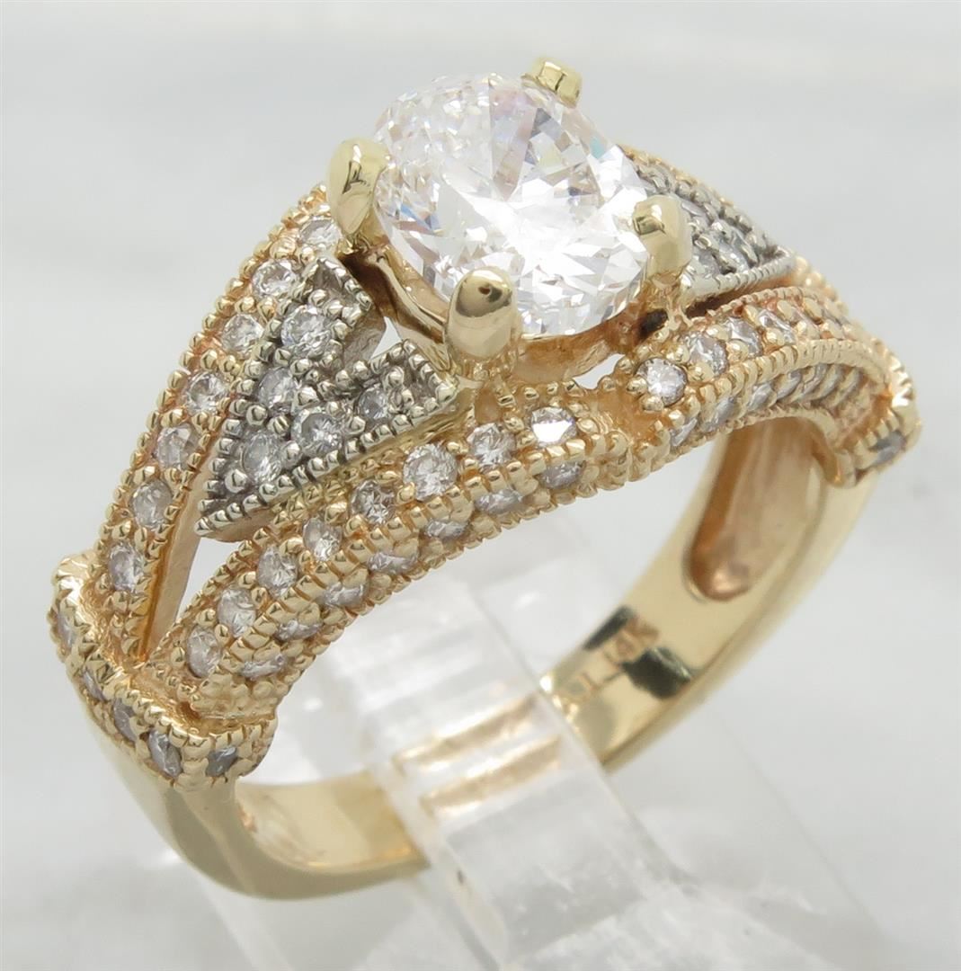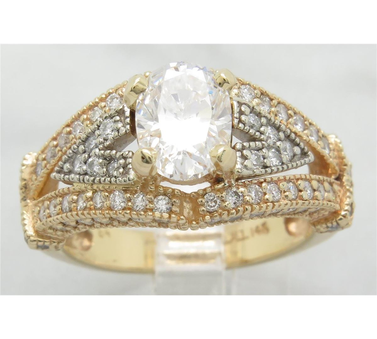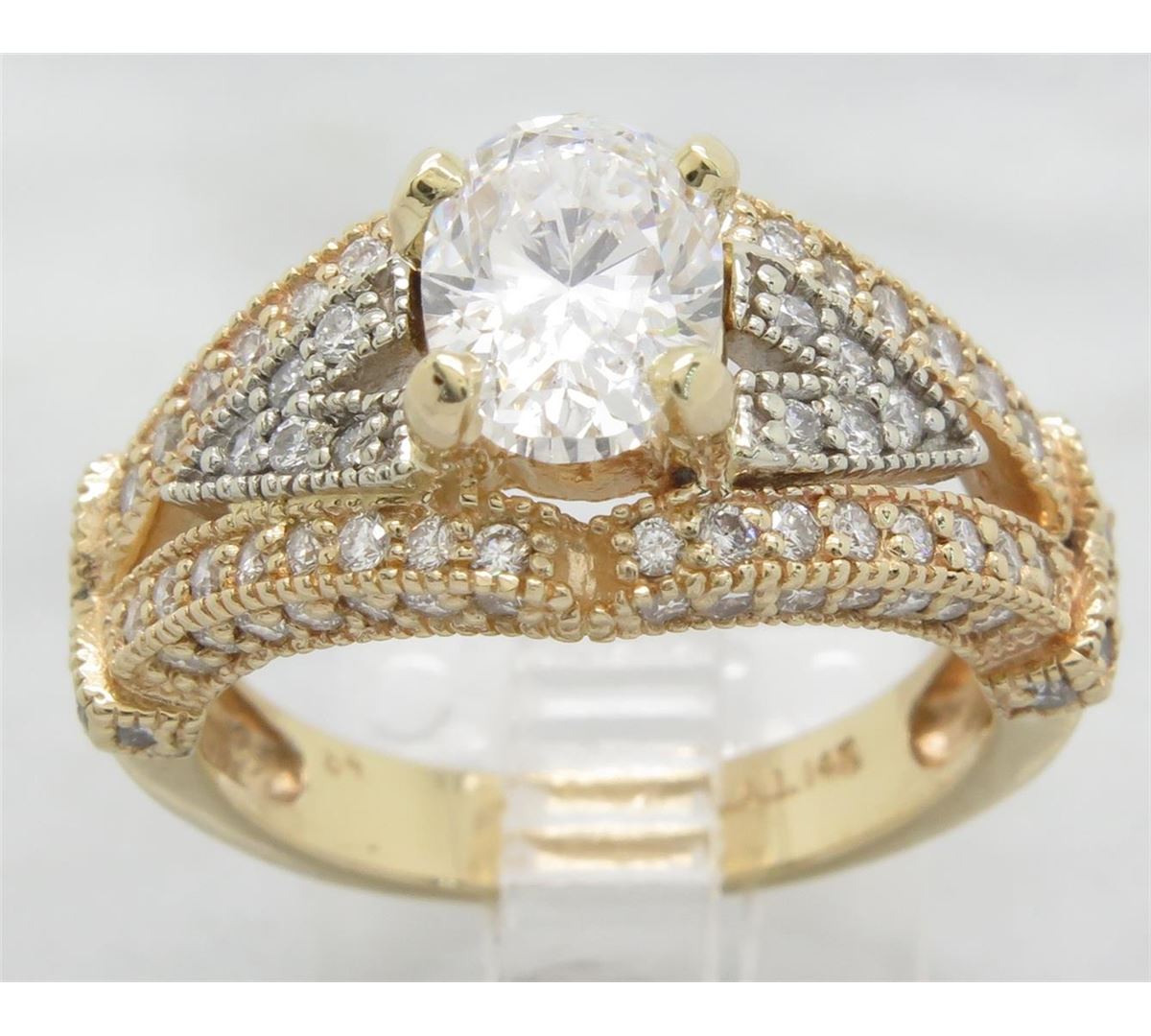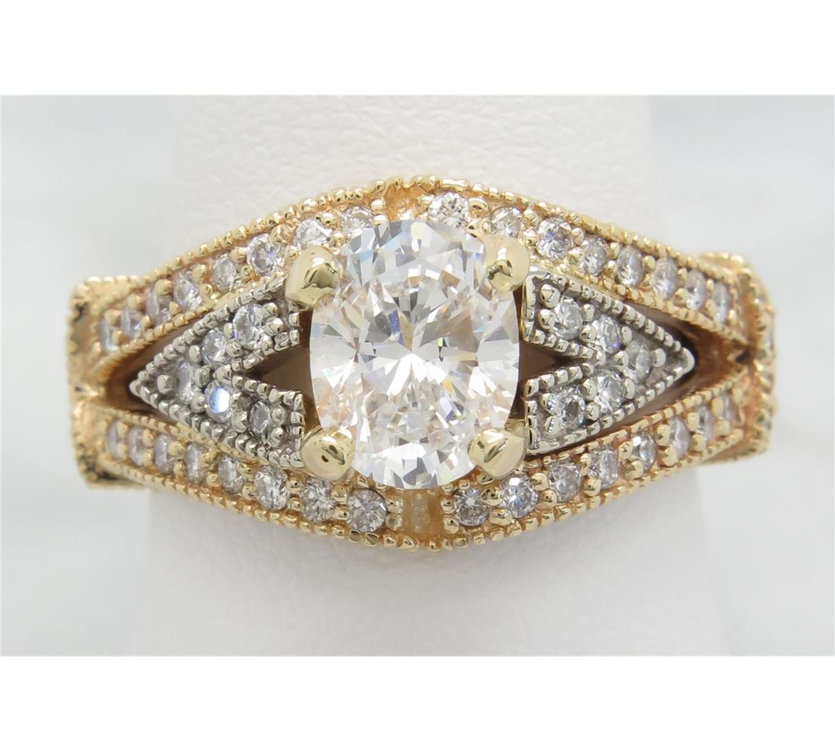 One tested 14K yellow gold diamond ring. Containing: One Oval Cut Diamond. Approximate Size: 1.40CT, Clarity: SI, Color: E-F. The diamond has been clarity enhanced (laser drilled). 82 Round Brilliant Cut Diamonds. Approximate total diamond weight: 2.25CTW. Diamonds are graded in the mounting, unless otherwise stated. Weight: 6.3 grams, Size: 7.0.