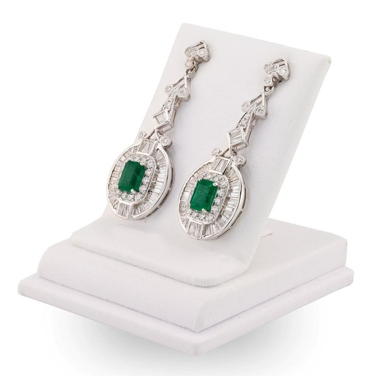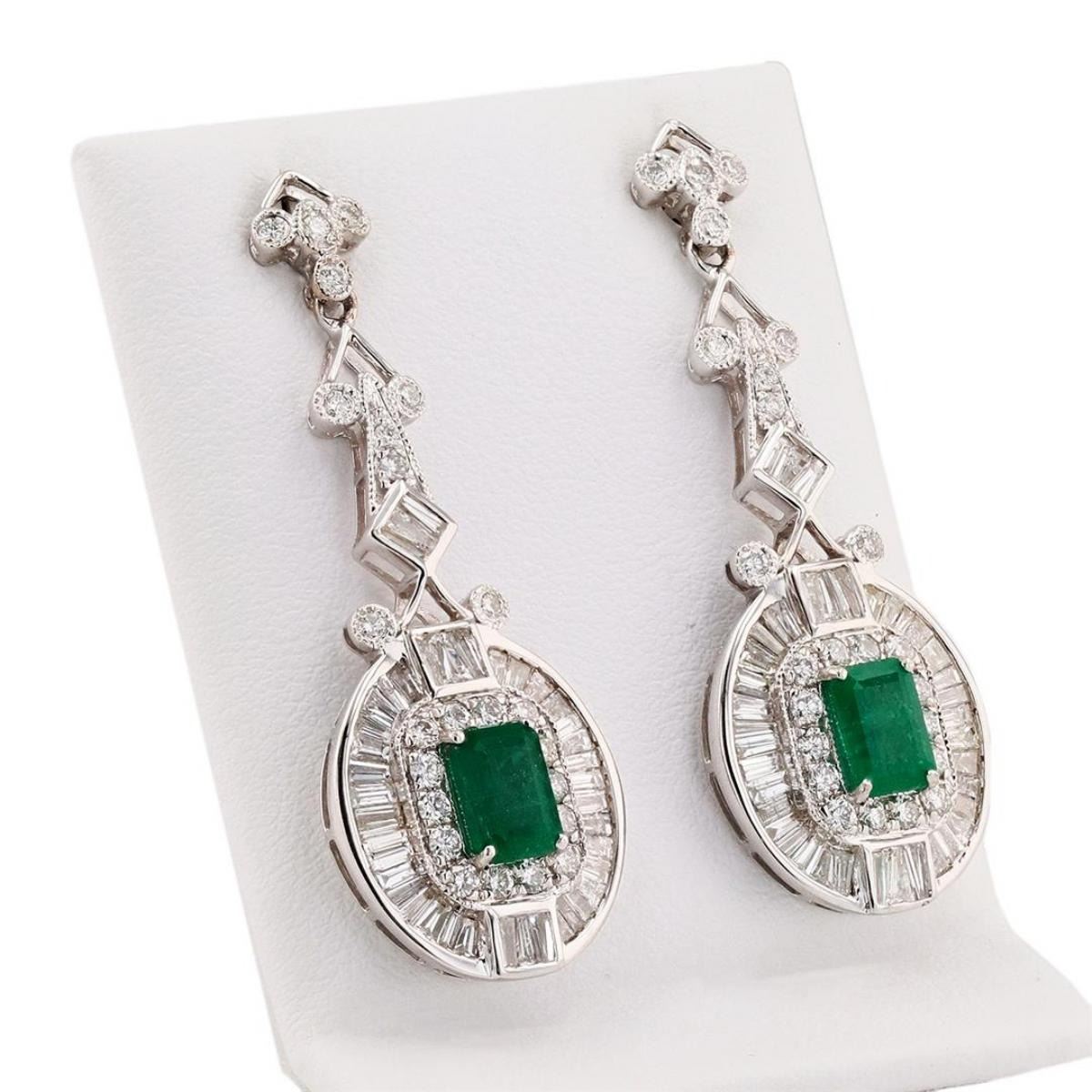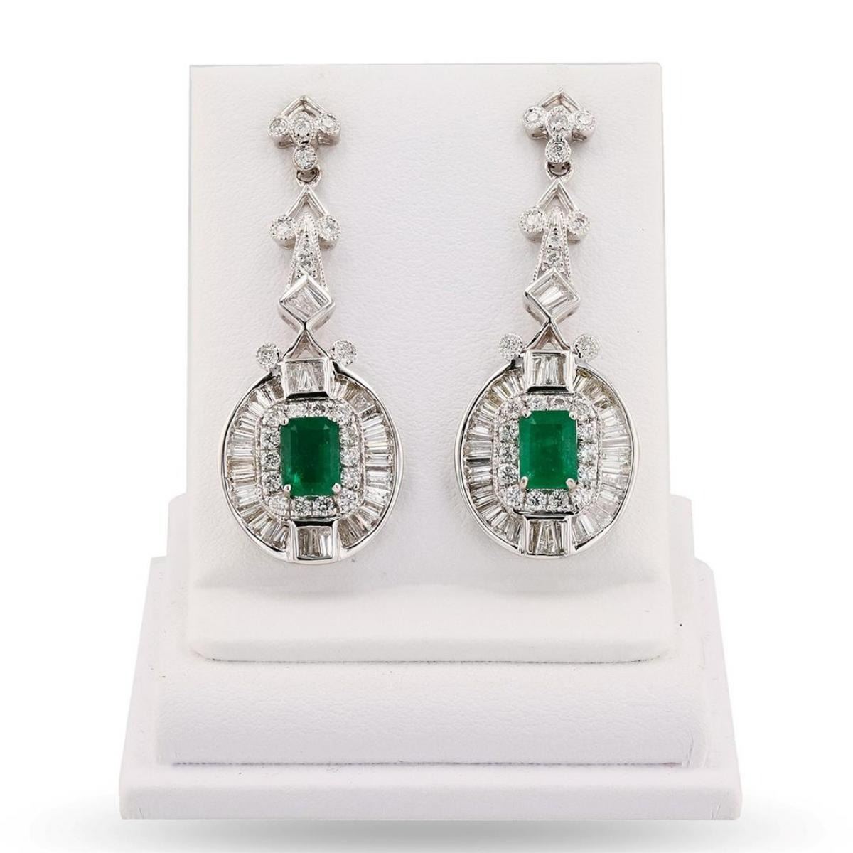 14K Gold Emerald and Diamond Earrings One polished, and tested, pair of 14K white gold earrings with a bright finish. The earrings are mounted with: 2 genuine emerald center stones weighing approximately 2.25 carats, and 126 genuine faceted diamonds weighing approximately 2.55 carats. This item weighs 8.9 grams, condition is new, excellent workmanship. MAIN GEMSTONES Species: Natural Beryl Variety: Emerald Shape: Octagonal Cutting Style: Step Cut Quantity: 2 Emeralds Average Dimensions: 7 x 5 mm Total Weight: 2.25 carats Color: Green Cut Grade: Very Good Refractive Index: 1.564 - 1.595 DR Birefringence: 0.005 to 0.009 Hardness: 7.5 - 8 ADJACENT GEMSTONES ON EARRINGS, Identity: Natural Diamond Cut: Baguette / Round Brilliant Quantity: 126 Diamonds Measurements: 2.0 - 3.0 mm (78 baguette) 1.2 - 1.7 mm (48 round) Total Weight: 2.55 carats Color Grade: F-H Clarity Grade: VS-2 to SI-2 Refractive Index: 2.418 Hardness: 10 TOTAL EMERALD WEIGHT: 2.25 cts TOTAL DIAMOND WEIGHT: 2.55 cts WEIGHT OF ITEM: 8.9 grams GOLD CONTENT: 14K White Gold