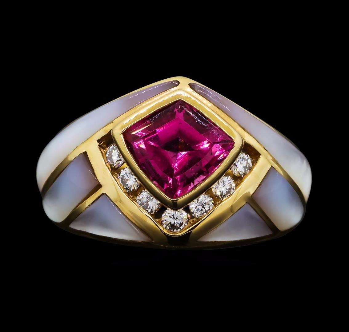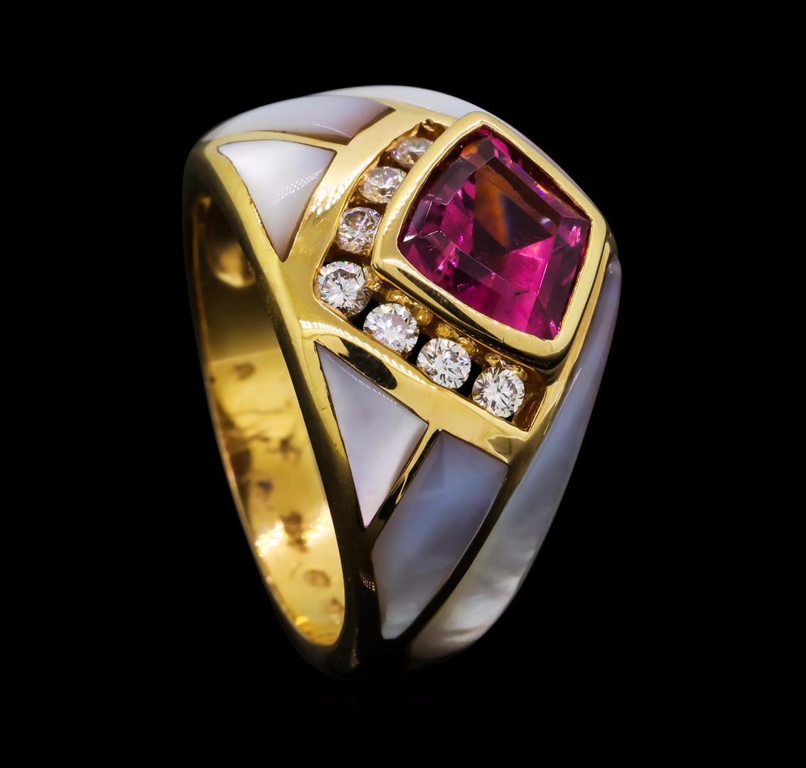 One ring featuring: 14KT yellow gold weighing 5.3 grams containing one pink tourmaline weighing 2.25ct, inlaid mother of pearl, and diamonds weighing 0.20ctw.