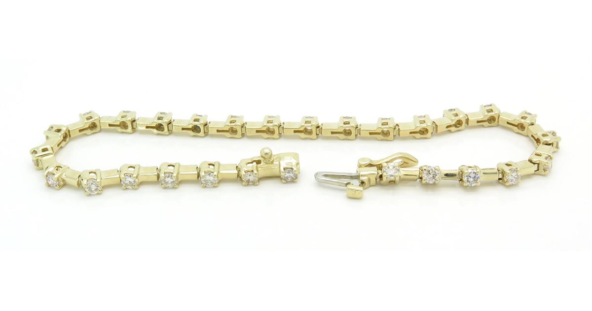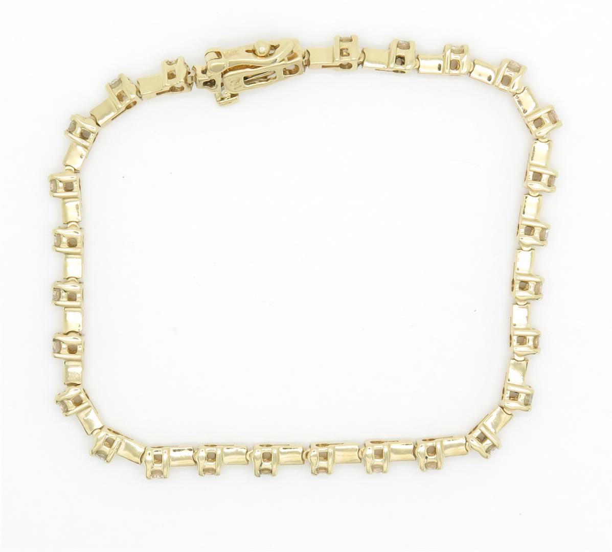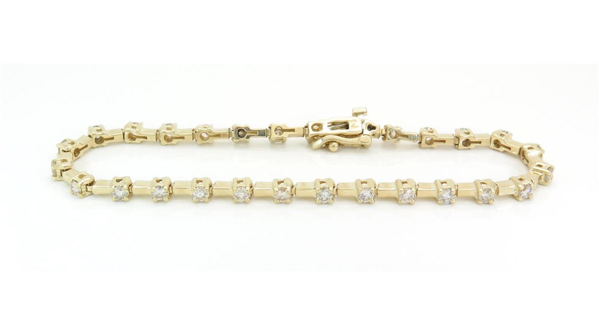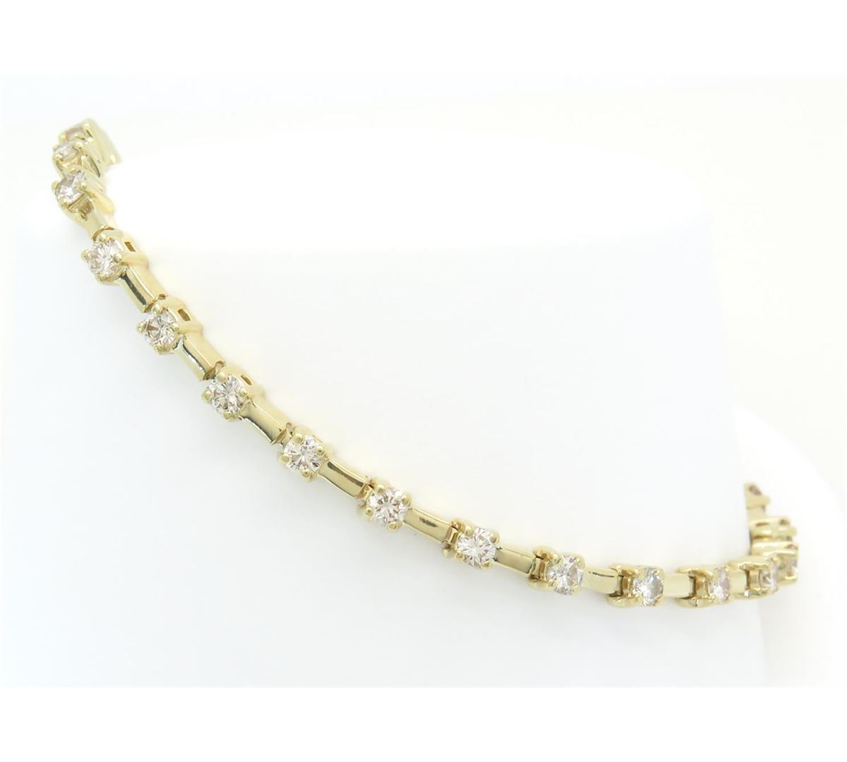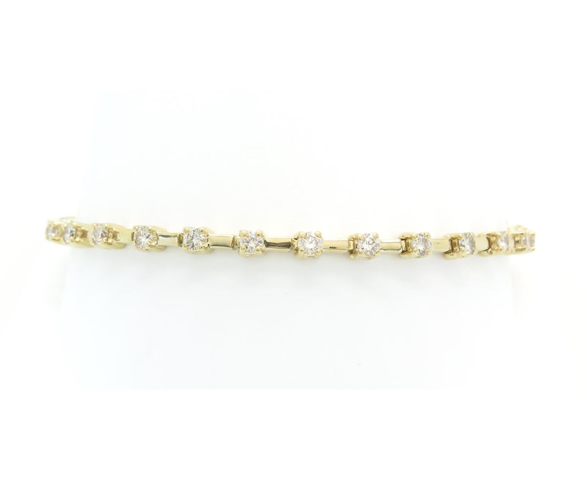 One tested 14K yellow gold diamond bracelet. Condition is new. Containing: 25 Round Brilliant Cut Diamonds. Clarity: SI, Color: G-I. Approximate total diamond weight: 2.25CTW. All diamonds are graded in the mounting unless otherwise stated. Weight of bracelet: 11.3 grams, Size: 7 inches.