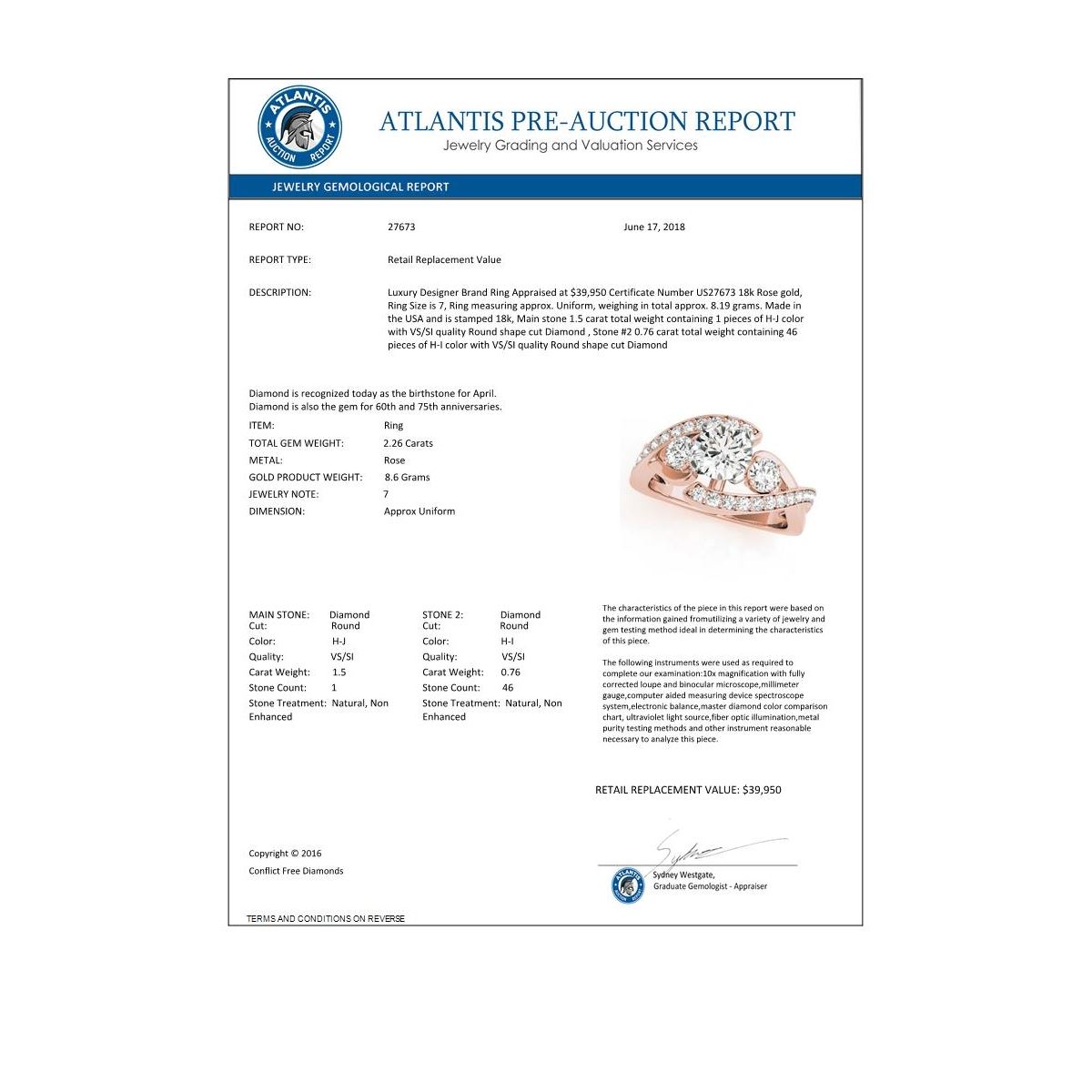 REF-635M8H -27673 ---- 2.26 CTW Certified VS/SI Diamond Bypass Solitaire Ring 18K Rose Gold ---- Luxury Designer Brand Ring Appraised at $39,950 Certificate Number US27673 18k Rose gold, Ring Size is 7, Ring measuring approx. Uniform, weighing in total approx. 8.19 grams. Made in the USA and is stamped 18k, Main stone 1.5 carat total weight containing 1 pieces of H-J color with VS/SI quality Round shape cut Diamond , Stone #2 0.76 carat total weight containing 46 pieces of H-I color with VS/SI quality Round shape cut Diamond