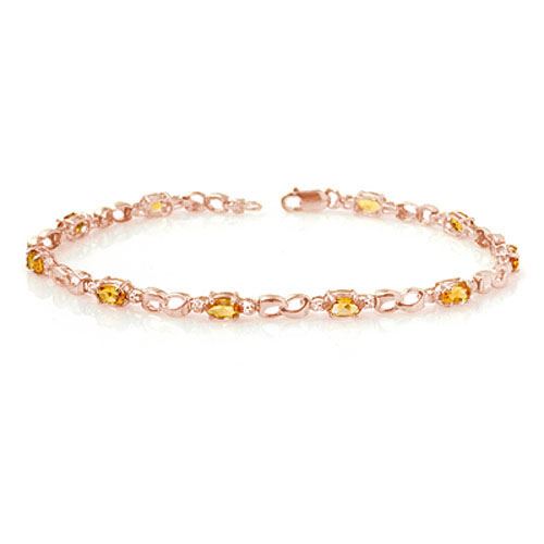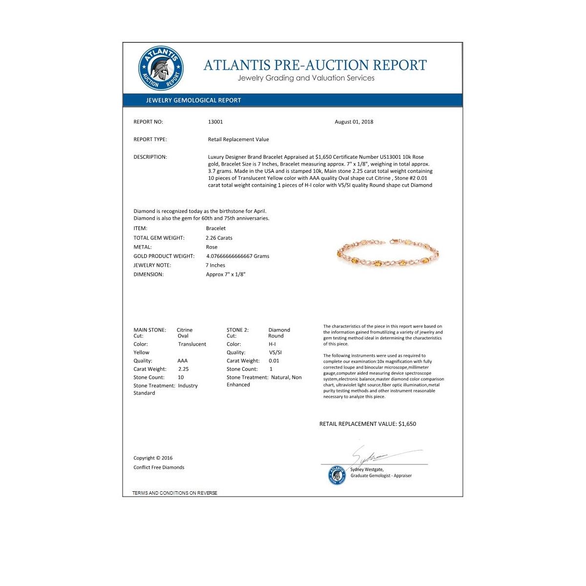 REF-27M3H -13001 ---- 2.26 CTW Citrine & Diamond Bracelet 10K Rose Gold ---- Luxury Designer Brand Bracelet Appraised at $1,650 Certificate Number US13001 10k Rose gold, Bracelet Size is 7 Inches, Bracelet measuring approx. 7" x 1/8", weighing in total approx. 3.7 grams. Made in the USA and is stamped 10k, Main stone 2.25 carat total weight containing 10 pieces of Translucent Yellow color with AAA quality Oval shape cut Citrine , Stone #2 0.01 carat total weight containing 1 pieces of H-I color with VS/SI quality Round shape cut Diamond