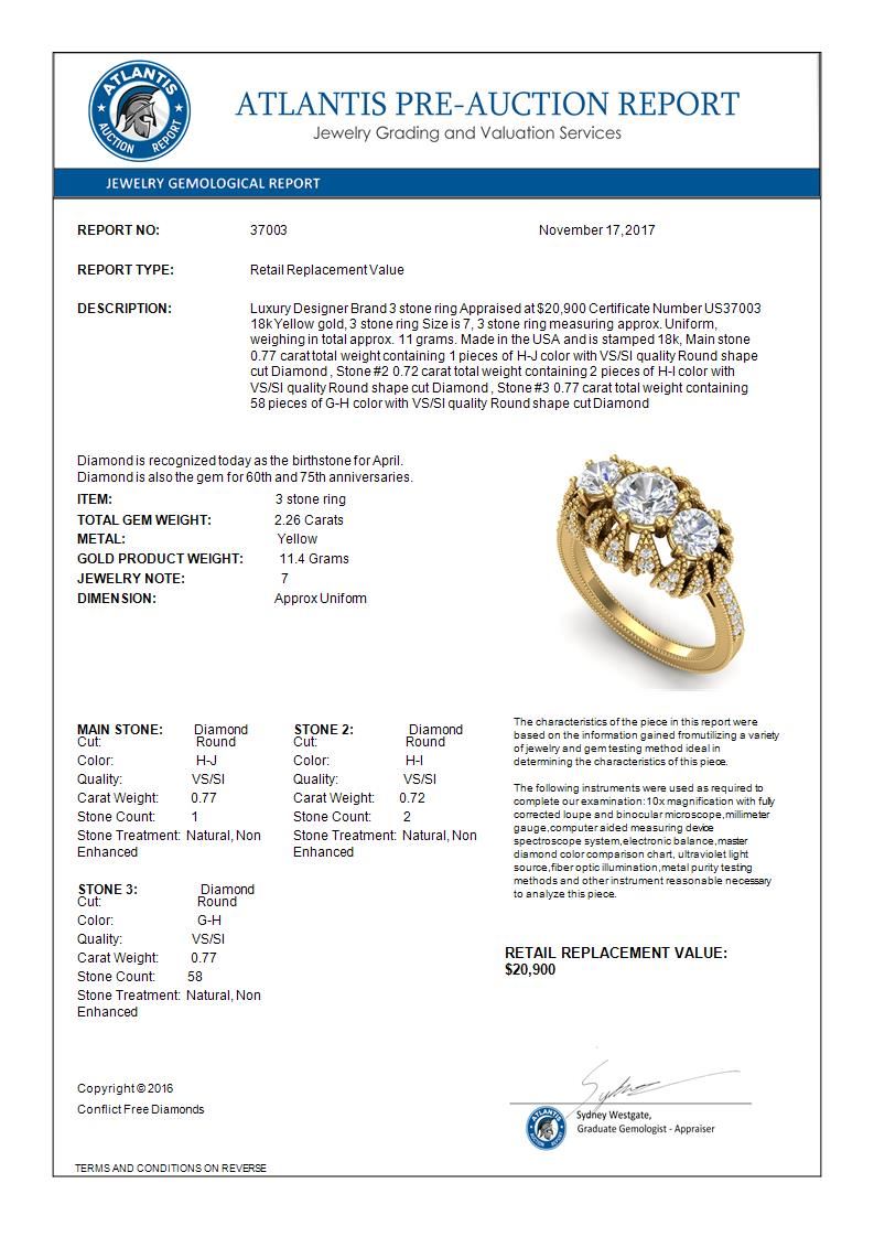 REF-345H5A -37003 ---- 2.26 CTW VS/SI Diamond Solitaire Art Deco 3 Stone Ring 18K Yellow Gold ---- Luxury Designer Brand 3 stone ring Appraised at $20,900 Certificate Number US37003 18k Yellow gold, 3 stone ring Size is 7, 3 stone ring measuring approx. Uniform, weighing in total approx. 11 grams. Made in the USA and is stamped 18k, Main stone 0.77 carat total weight containing 1 pieces of H-J color with VS/SI quality Round shape cut Diamond , Stone #2 0.72 carat total weight containing 2 pieces of H-I color with VS/SI quality Round shape cut Diamond , Stone #3 0.77 carat total weight containing 58 pieces of G-H color with VS/SI quality Round shape cut Diamond