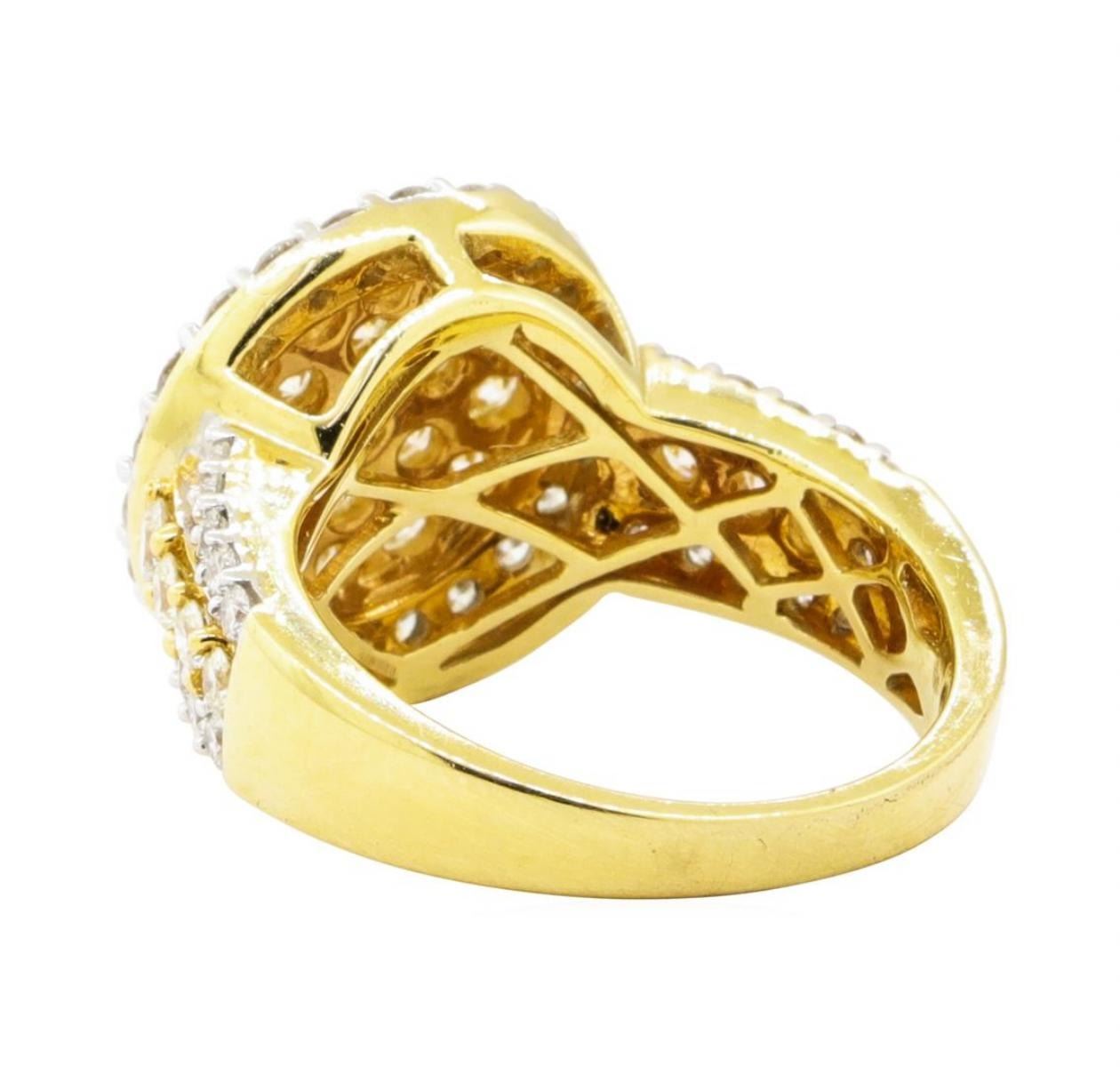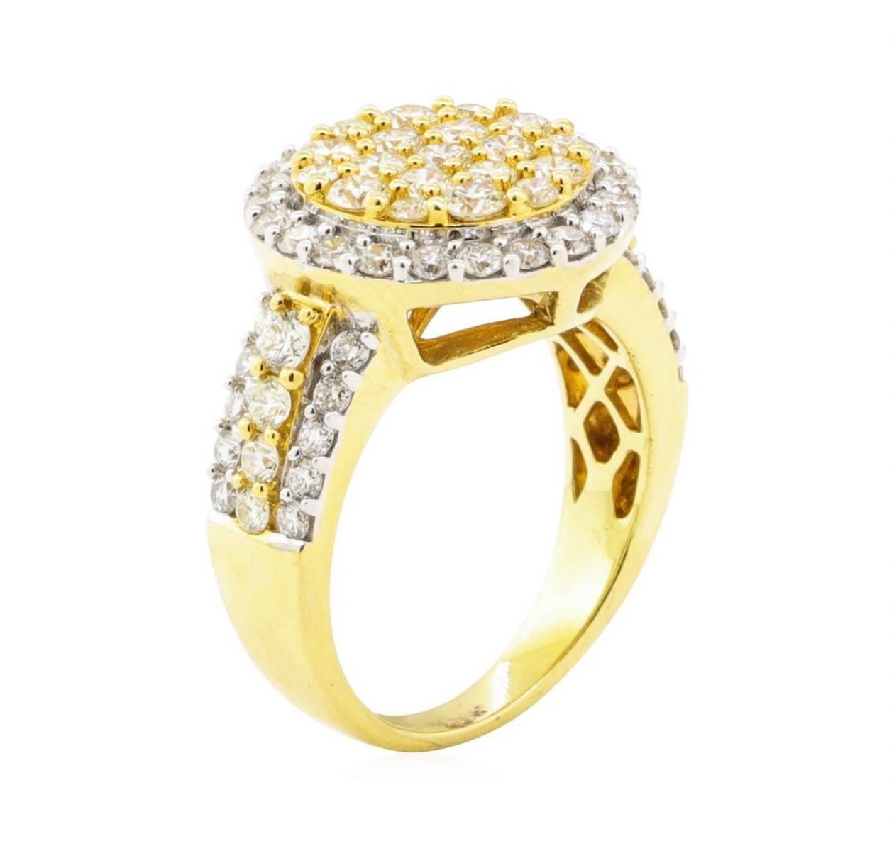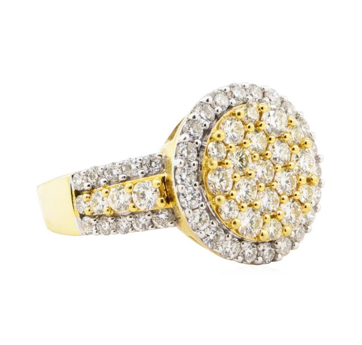 One electronically tested 18KT yellow with rhodium plating gold lady's cast fashion ring with a cathedral round halo with a bright polish finish. The featured lady's ring has a shank measuring 2.60 millimeters wide. Identified with markings of '18K'. Condition is new, good workmanship. Containing: Twenty-Five prong set round brilliant cut diamonds, measuring 2.60 - 1.90 x 1.40mm (depth est.) approximate total weight of 25 Stones = 1.24ct. Graded in the setting. Color Very Light Yellow Clarity VS-1 to VS-2 Cut Very Good Forty-Four prong set round brilliant cut diamonds, measuring 1.90 - 1.80 x 1.11mm (depth est.) approximate total weight of 44 Stones = 1.02ct. Graded in the setting. Color G - I Clarity VS-1 to SI-1 Cut Very Good. Total Weight of Diamonds 2.26ct.. Total Weight of Ring 9.40gm GAS Appraised at $7585.00. GAS Appraised.