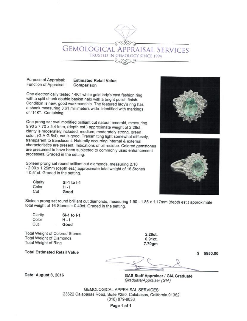 One electronically tested 14KT white gold lady's cast fashion ring with a split shank double basket halo with a bright polish finish. The featured lady's ring has a shank measuring 3.61 millimeters wide. Identified with markings of '14K'. Condition is new, good workmanship. Containing: One prong set oval modified brilliant cut natural emerald, measuring 9.90 x 7.70 x 5.41mm, (depth est.) approximate weight of 2.26ct., clarity is moderately included, medium, moderately strong, green color, (GIA G 5/4), cut is good. Transmitting light somewhat diffusely, transparent to translucent. Naturally occurring internal & external characteristics are present. Indications of oil residue. Colored gemstones are presumed to have been subjected to commonly used enhancement processes. Graded in the setting. Sixteen prong set round brilliant cut diamonds, measuring 2.10 - 2.00 x 1.25mm (depth est.) approximate total weight of 16 Stones = 0.51ct. Graded in the setting. Clarity SI-1 to I-1. Color: H - I Cut Good Sixteen prong set round brilliant cut diamonds, measuring 1.90 - 1.85 x 1.17mm (depth est.) approximate total weight of 16 Stones = 0.40ct. Graded in the setting. Clarity SI-1 to I-1. Color: H - I Cut Good. Total Weight of Colored Stones 2.26ct.. Total Weight of Diamonds 0.91ct.. Total Weight of Ring 7.70gm. GAS Appraised at $5,850.00.