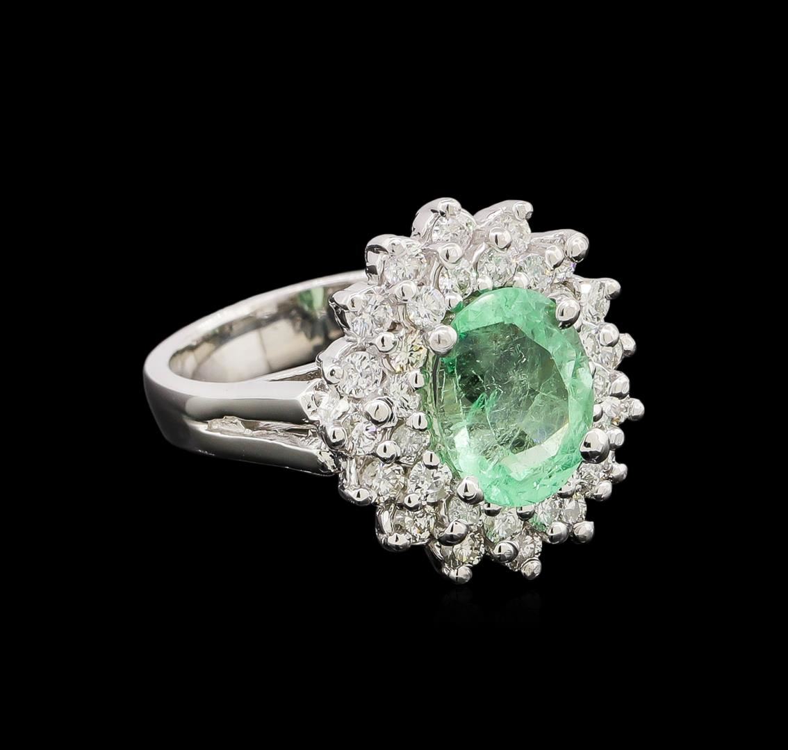 One electronically tested 14KT white gold lady's cast fashion ring with a split shank double basket halo with a bright polish finish. The featured lady's ring has a shank measuring 3.61 millimeters wide. Identified with markings of '14K'. Condition is new, good workmanship. Containing: One prong set oval modified brilliant cut natural emerald, measuring 9.90 x 7.70 x 5.41mm, (depth est.) approximate weight of 2.26ct., clarity is moderately included, medium, moderately strong, green color, (GIA G 5/4), cut is good. Transmitting light somewhat diffusely, transparent to translucent. Naturally occurring internal & external characteristics are present. Indications of oil residue. Colored gemstones are presumed to have been subjected to commonly used enhancement processes. Graded in the setting. Sixteen prong set round brilliant cut diamonds, measuring 2.10 - 2.00 x 1.25mm (depth est.) approximate total weight of 16 Stones = 0.51ct. Graded in the setting. Clarity SI-1 to I-1. Color: H - I Cut Good Sixteen prong set round brilliant cut diamonds, measuring 1.90 - 1.85 x 1.17mm (depth est.) approximate total weight of 16 Stones = 0.40ct. Graded in the setting. Clarity SI-1 to I-1. Color: H - I Cut Good. Total Weight of Colored Stones 2.26ct.. Total Weight of Diamonds 0.91ct.. Total Weight of Ring 7.70gm. GAS Appraised at $5,850.00.