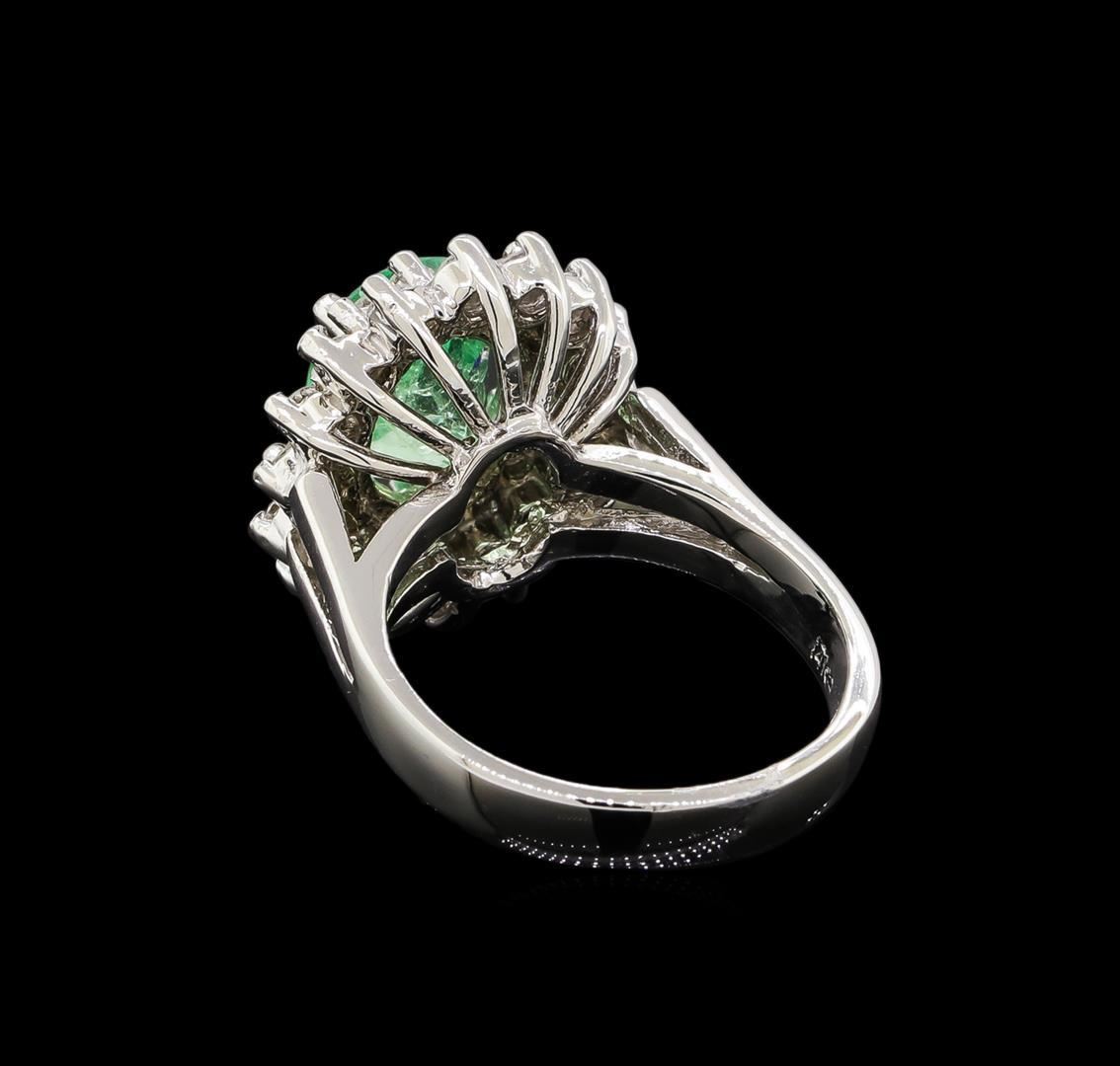 One electronically tested 14KT white gold lady's cast fashion ring with a split shank double basket halo with a bright polish finish. The featured lady's ring has a shank measuring 3.61 millimeters wide. Identified with markings of '14K'. Condition is new, good workmanship. Containing: One prong set oval modified brilliant cut natural emerald, measuring 9.90 x 7.70 x 5.41mm, (depth est.) approximate weight of 2.26ct., clarity is moderately included, medium, moderately strong, green color, (GIA G 5/4), cut is good. Transmitting light somewhat diffusely, transparent to translucent. Naturally occurring internal & external characteristics are present. Indications of oil residue. Colored gemstones are presumed to have been subjected to commonly used enhancement processes. Graded in the setting. Sixteen prong set round brilliant cut diamonds, measuring 2.10 - 2.00 x 1.25mm (depth est.) approximate total weight of 16 Stones = 0.51ct. Graded in the setting. Clarity SI-1 to I-1. Color: H - I Cut Good Sixteen prong set round brilliant cut diamonds, measuring 1.90 - 1.85 x 1.17mm (depth est.) approximate total weight of 16 Stones = 0.40ct. Graded in the setting. Clarity SI-1 to I-1. Color: H - I Cut Good. Total Weight of Colored Stones 2.26ct.. Total Weight of Diamonds 0.91ct.. Total Weight of Ring 7.70gm. GAS Appraised.