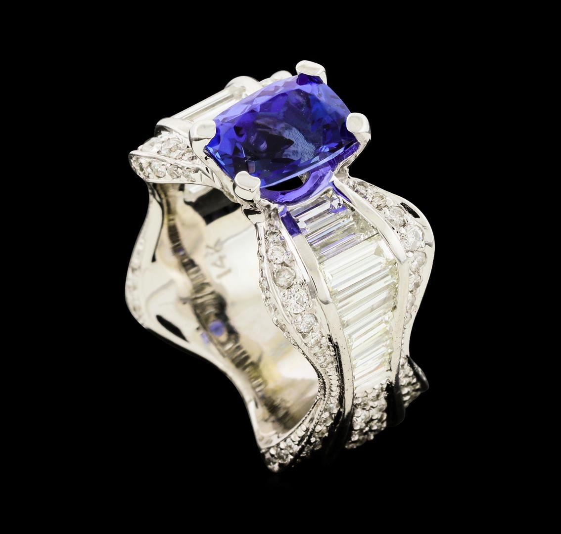 One electronically tested 14KT white gold lady's cast fashion ring with a square European shank with a bright polish with milgrain detailing finish. Both edges of the ring have an undulating sidewall. The featured lady's ring has a shank measuring 6.20 millimeters wide. Identified with markings of '14K'. Condition is new, good workmanship. Containing: One prong set rectangular cushion modified brilliant cut natural tanzanite, measuring 8.58 x 6.50 x 4.96mm, (depth est.) approximate weight of 2.26ct., clarity is slightly included, medium dark, moderately strong, violetish blue color, (GIA vB 6/4), cut is good. Transmitting light with a minimum of distortion, transparent. Colored gemstones are presumed to have been subjected to commonly used enhancement processes. Graded in the setting. Sixteen channel set baguette cut diamonds, measuring from 2.60 x 1.60 x 1.36mm (depth est.) to 4.60 x 2.00 x 1.70mm (depth est.) approximate total weight of 16 Stones = 1.45ct. Graded in the setting. Clarity VS-1 to VS-2. Color: H - I Cut Good One Hundred Eighteen prong set round brilliant cut diamonds, measuring 1.50 - 0.90 x 0.74mm (depth est.) approximate total weight of 118 Stones = 0.64ct. Graded in the setting. Clarity SI-1 to SI-2. Color: G - I Cut Good. Total Weight of Colored Stones 2.26ct.. Total Weight of Diamonds 2.09ct.. Total Weight of Ring 11.20gm. GAS Appraised at $9,225.00.