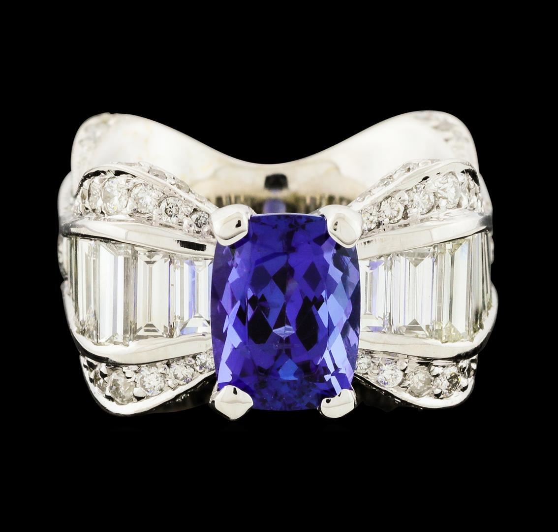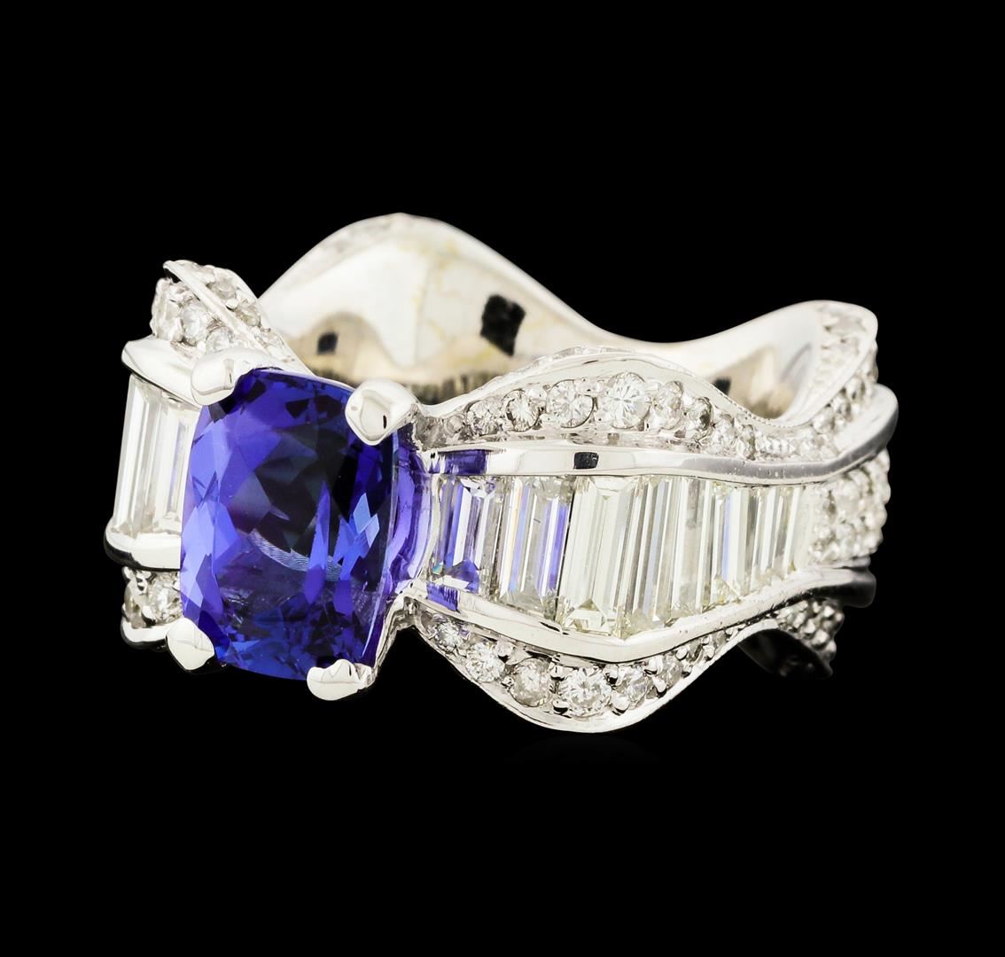 One electronically tested 14KT white gold lady's cast fashion ring with a square European shank with a bright polish with milgrain detailing finish. Both edges of the ring have an undulating sidewall. The featured lady's ring has a shank measuring 6.20 millimeters wide. Identified with markings of '14K'. Condition is new, good workmanship. Containing: One prong set rectangular cushion modified brilliant cut natural tanzanite, measuring 8.58 x 6.50 x 4.96mm, (depth est.) approximate weight of 2.26ct., clarity is slightly included, medium dark, moderately strong, violetish blue color, (GIA vB 6/4), cut is good. Transmitting light with a minimum of distortion, transparent. Colored gemstones are presumed to have been subjected to commonly used enhancement processes. Graded in the setting. Sixteen channel set baguette cut diamonds, measuring from 2.60 x 1.60 x 1.36mm (depth est.) to 4.60 x 2.00 x 1.70mm (depth est.) approximate total weight of 16 Stones = 1.45ct. Graded in the setting. Clarity VS-1 to VS-2. Color: H - I Cut Good One Hundred Eighteen prong set round brilliant cut diamonds, measuring 1.50 - 0.90 x 0.74mm (depth est.) approximate total weight of 118 Stones = 0.64ct. Graded in the setting. Clarity SI-1 to SI-2. Color: G - I Cut Good. Total Weight of Colored Stones 2.26ct.. Total Weight of Diamonds 2.09ct.. Total Weight of Ring 11.20gm. GAS Appraised at $9,225.00.