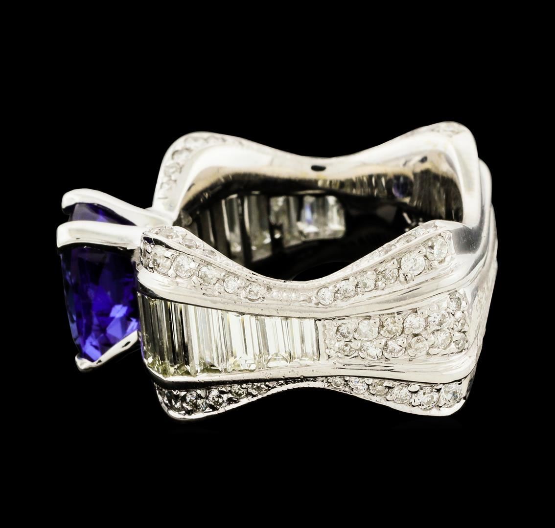 One electronically tested 14KT white gold lady's cast fashion ring with a square European shank with a bright polish with milgrain detailing finish. Both edges of the ring have an undulating sidewall. The featured lady's ring has a shank measuring 6.20 millimeters wide. Identified with markings of '14K'. Condition is new, good workmanship. Containing: One prong set rectangular cushion modified brilliant cut natural tanzanite, measuring 8.58 x 6.50 x 4.96mm, (depth est.) approximate weight of 2.26ct., clarity is slightly included, medium dark, moderately strong, violetish blue color, (GIA vB 6/4), cut is good. Transmitting light with a minimum of distortion, transparent. Colored gemstones are presumed to have been subjected to commonly used enhancement processes. Graded in the setting. Sixteen channel set baguette cut diamonds, measuring from 2.60 x 1.60 x 1.36mm (depth est.) to 4.60 x 2.00 x 1.70mm (depth est.) approximate total weight of 16 Stones = 1.45ct. Graded in the setting. Clarity VS-1 to VS-2. Color: H - I Cut Good One Hundred Eighteen prong set round brilliant cut diamonds, measuring 1.50 - 0.90 x 0.74mm (depth est.) approximate total weight of 118 Stones = 0.64ct. Graded in the setting. Clarity SI-1 to SI-2. Color: G - I Cut Good. Total Weight of Colored Stones 2.26ct.. Total Weight of Diamonds 2.09ct.. Total Weight of Ring 11.20gm. GAS Appraised at $9,225.00.