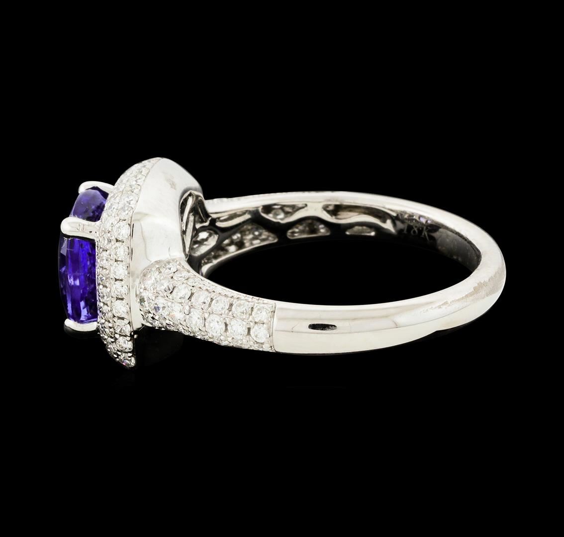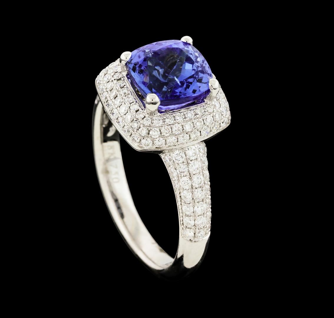 One electronically tested 18KT white gold lady's cast fashion ring with a cushion halo with a bright polish with milgrain detailing finish. The featured lady's ring has a shank measuring 2.43 millimeters wide. Identified with markings of '18K 750'. Condition is new, good workmanship. Containing: One prong set square cushion modified brilliant cut natural tanzanite, measuring 7.45 x 7.34 x 4.81mm, (depth est.) 10%. bulge factor, approximate weight of 2.26ct., clarity is slightly included, medium dark, very slightly grayish, violetish blue color, (GIA vB 6/3), cut is good. Transmitting light with a minimum of distortion, transparent. Colored gemstones are presumed to have been subjected to commonly used enhancement processes. Graded in the setting. Forty-Two prong set round brilliant cut diamonds, measuring 1.40 - 1.20 x 0.81mm (depth est.) approximate total weight of 42 Stones = 0.33ct. Graded in the setting. Clarity VS-2 to SI-1. Color: H - I Cut Very Good One Hundred Four prong set round brilliant cut diamonds, measuring 1.10 - 0.90 x 0.60mm (depth est.) approximate total weight of 104 Stones = 0.35ct. Graded in the setting. Clarity VS-2 to SI-1. Color: H - I Cut Good. Total Weight of Colored Stones 2.26ct.. Total Weight of Diamonds 0.68ct.. Total Weight of Ring 2.70gm. GAS Appraised at $5,700.00.