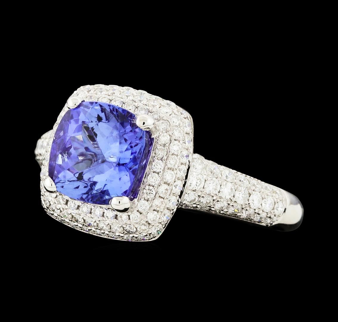 One electronically tested 18KT white gold lady's cast fashion ring with a cushion halo with a bright polish with milgrain detailing finish. The featured lady's ring has a shank measuring 2.43 millimeters wide. Identified with markings of '18K 750'. Condition is new, good workmanship. Containing: One prong set square cushion modified brilliant cut natural tanzanite, measuring 7.45 x 7.34 x 4.81mm, (depth est.) 10%. bulge factor, approximate weight of 2.26ct., clarity is slightly included, medium dark, very slightly grayish, violetish blue color, (GIA vB 6/3), cut is good. Transmitting light with a minimum of distortion, transparent. Colored gemstones are presumed to have been subjected to commonly used enhancement processes. Graded in the setting. Forty-Two prong set round brilliant cut diamonds, measuring 1.40 - 1.20 x 0.81mm (depth est.) approximate total weight of 42 Stones = 0.33ct. Graded in the setting. Clarity VS-2 to SI-1. Color: H - I Cut Very Good One Hundred Four prong set round brilliant cut diamonds, measuring 1.10 - 0.90 x 0.60mm (depth est.) approximate total weight of 104 Stones = 0.35ct. Graded in the setting. Clarity VS-2 to SI-1. Color: H - I Cut Good. Total Weight of Colored Stones 2.26ct.. Total Weight of Diamonds 0.68ct.. Total Weight of Ring 2.70gm. GAS Appraised at $5,700.00.