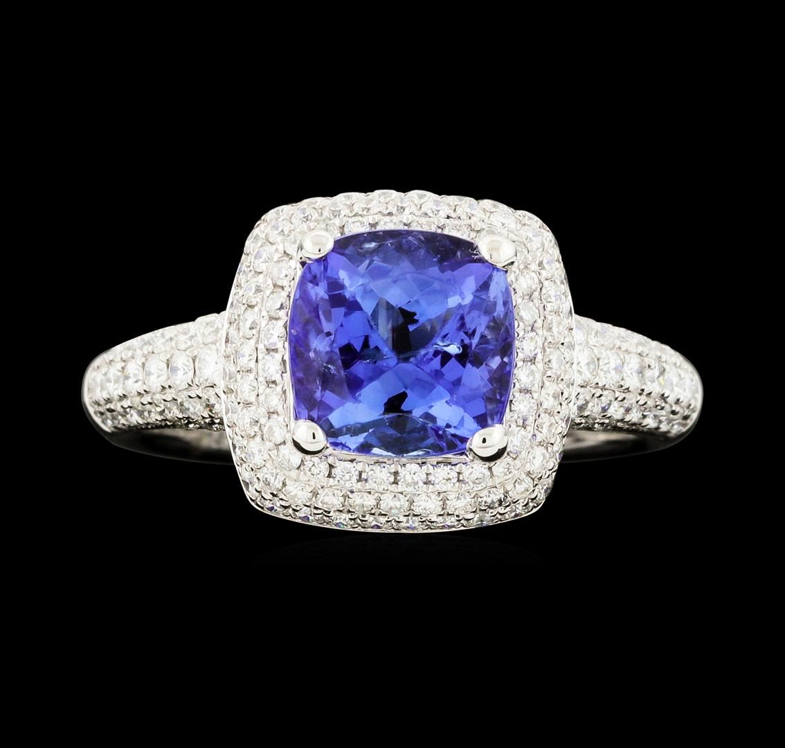 One electronically tested 18KT white gold lady's cast fashion ring with a cushion halo with a bright polish with milgrain detailing finish. The featured lady's ring has a shank measuring 2.43 millimeters wide. Identified with markings of '18K 750'. Condition is new, good workmanship. Containing: One prong set square cushion modified brilliant cut natural tanzanite, measuring 7.45 x 7.34 x 4.81mm, (depth est.) 10%. bulge factor, approximate weight of 2.26ct., clarity is slightly included, medium dark, very slightly grayish, violetish blue color, (GIA vB 6/3), cut is good. Transmitting light with a minimum of distortion, transparent. Colored gemstones are presumed to have been subjected to commonly used enhancement processes. Graded in the setting. Forty-Two prong set round brilliant cut diamonds, measuring 1.40 - 1.20 x 0.81mm (depth est.) approximate total weight of 42 Stones = 0.33ct. Graded in the setting. Clarity VS-2 to SI-1. Color: H - I Cut Very Good One Hundred Four prong set round brilliant cut diamonds, measuring 1.10 - 0.90 x 0.60mm (depth est.) approximate total weight of 104 Stones = 0.35ct. Graded in the setting. Clarity VS-2 to SI-1. Color: H - I Cut Good. Total Weight of Colored Stones 2.26ct.. Total Weight of Diamonds 0.68ct.. Total Weight of Ring 2.70gm. GAS Appraised at $5,700.00.