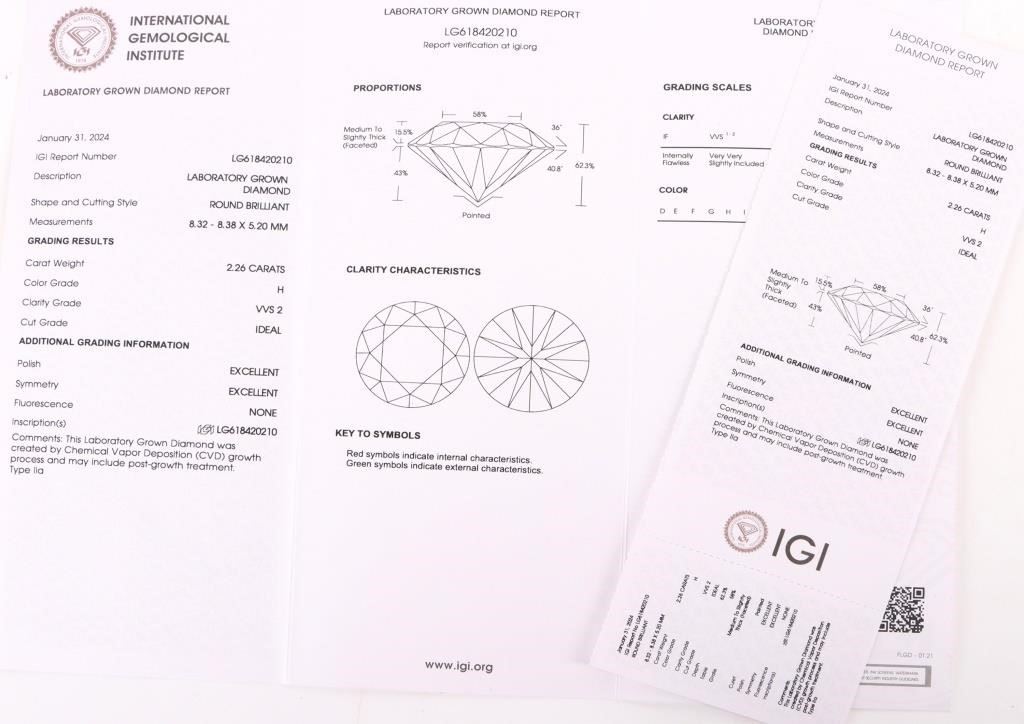 2.26ct VVS-2 H color brilliant round lab diamond to include an IGI certification and casing for the diamond.