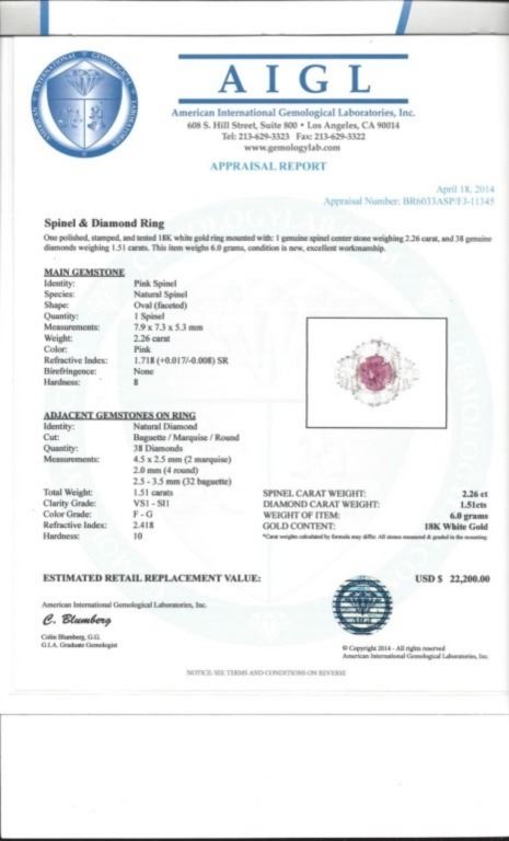 Regarding Appraised Jewelry and Loose Stones - Auctionfarm sends them out to a third party for Retail Replacement Value Appraisals, which are the most common. These types of evaluations are written for insurance needs. This would be the cost to replace the jewelry with an item of equal quality and kind, considered to be the current market price or the replacement value. This type of appraisal is done to protect you in the event of damage or loss of a valuable item. Our appraisals are conducted by independent 3rd Party appraisal firms that utilizes Certified GIA Gemologist. Appraisals should be used for verification of gemstone and/or metal weight, size, and grade only, not actual value. Appraisal value should be considered for insurance purposes only, not actual value, as price varies greatly from retail locations thru out the world. Items should not be purchased with the expectation to resell for appraisal price, or for profit.