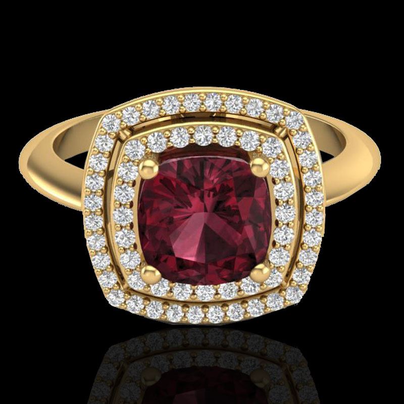 REF-65M3H -20763 ---- 2.27 CTW Garnet & Micro VS/SI Diamond Pave Halo Ring 18K Yellow Gold ---- Luxury Designer Brand Ring Appraised at $4,300 Certificate Number US20763 18k Yellow gold, Ring Size is 6.5, Ring measuring approx. 1/2"X 1/2" , weighing in total approx. 4.3 grams. Made in the USA and is stamped 18k, Main stone 1.85 carat total weight containing 1 pieces of Saturated purplish Red color with AAA quality Cushion shape cut Garnet , Stone #2 0.42 carat total weight containing 58 pieces of H-I color with VS/SI quality Round shape cut Diamond