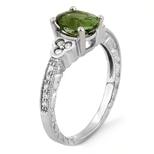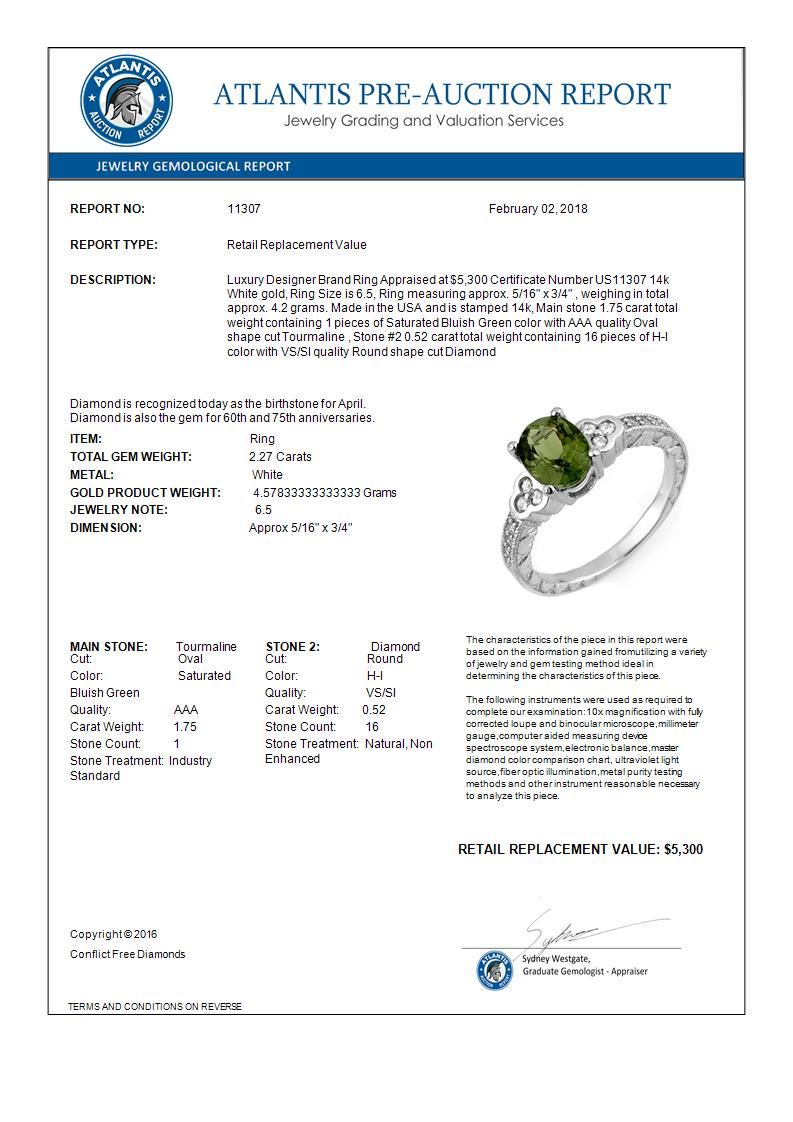 REF-69Y3K -11307 ---- 2.27 CTW Green Tourmaline & Diamond Ring 14K White Gold ---- Luxury Designer Brand Ring Appraised at $5,300 Certificate Number US11307 14k White gold, Ring Size is 6.5, Ring measuring approx. 5/16" x 3/4" , weighing in total approx. 4.2 grams. Made in the USA and is stamped 14k, Main stone 1.75 carat total weight containing 1 pieces of Saturated Bluish Green color with AAA quality Oval shape cut Tourmaline , Stone #2 0.52 carat total weight containing 16 pieces of H-I color with VS/SI quality Round shape cut Diamond
