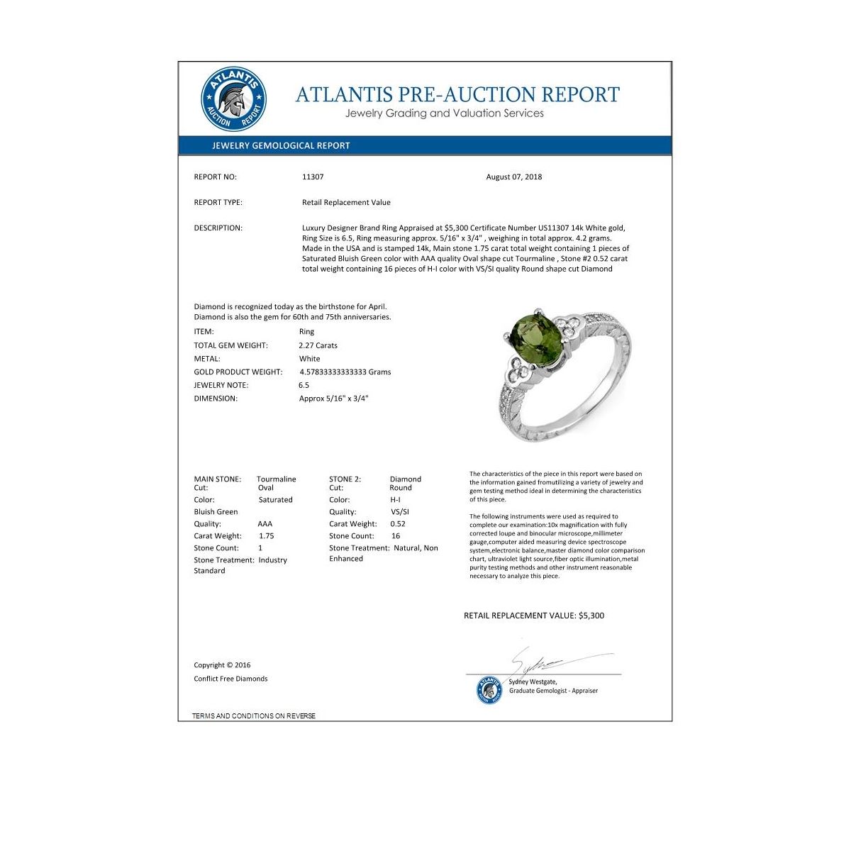 REF-69Y3K -11307 ---- 2.27 CTW Green Tourmaline & Diamond Ring 14K White Gold ---- Luxury Designer Brand Ring Appraised at $5,300 Certificate Number US11307 14k White gold, Ring Size is 6.5, Ring measuring approx. 5/16" x 3/4" , weighing in total approx. 4.2 grams. Made in the USA and is stamped 14k, Main stone 1.75 carat total weight containing 1 pieces of Saturated Bluish Green color with AAA quality Oval shape cut Tourmaline , Stone #2 0.52 carat total weight containing 16 pieces of H-I color with VS/SI quality Round shape cut Diamond