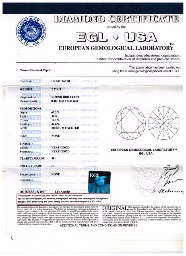 2.27 ct EGL Round Brilliant H, SI1 Solitaire Ring 18K Rose Gold RingSize 6.5|**Certificate:84917605D|**Measurement:8.48-8.42x5.34mm|**Total Depth %:63.2|**Table %:58|**Girdle:Medium faceted |**Culet:None |**Polish:Very Good |** Symmetry:Very Good |**Flourescene:None