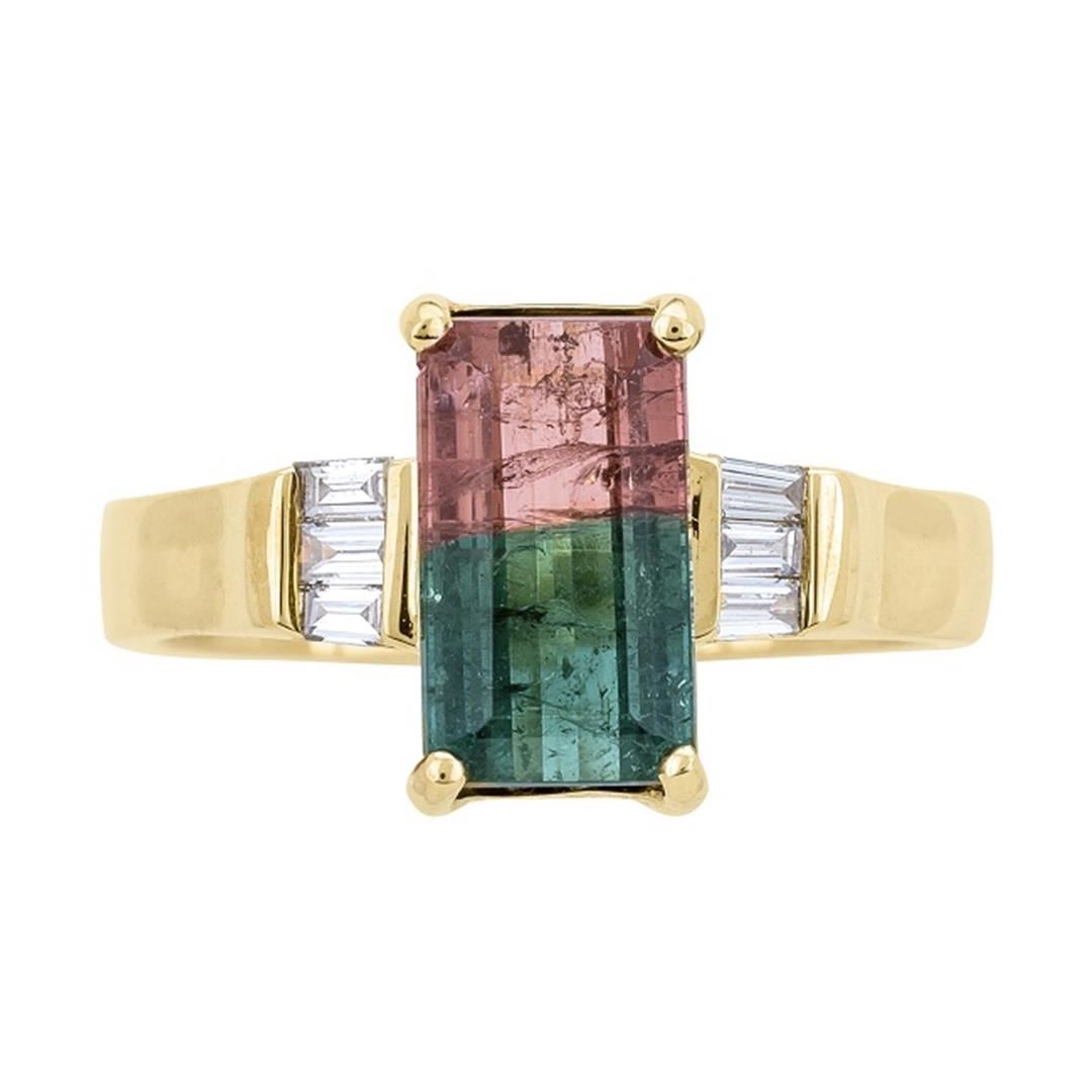 One Bi-Color Tourmaline and Diamond Ring featuring: 14KT Yellow Gold with a total weight of 5.27 grams, Bi-Color Tourmaline with a total weight of 2.27ct and 6 Baguette Cut Diamonds with a total weight of 0.16ctw.