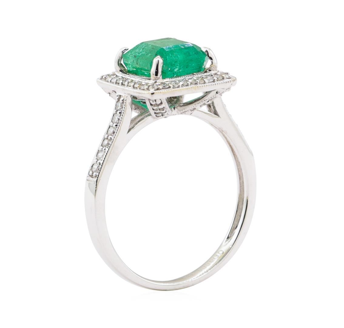 One electronically tested 18KT white gold ladies cast & assembled emerald & diamond ring. The ring features an emerald set within a diamond bezel, supported by a diamond set under gallery and diamond ribbon shoulders, completed by a two millimeter wide band. Bright polish finish with milgrain detailing. Trademark is Orianne. Identified with markings of "18K". Condition is new, good workmanship. Containing: One prong set square step cut natural emerald, measuring 7.10 x 7.00 x 5.40mm, exact weight 2.27ct., clarity is heavily included, type III, medium, very slightly grayish, very slightly bluish green color, (GIA vslbG 5/3), cut is good. Transmitting light somewhat diffusely, transparent to translucent. Naturally occurring internal & external characteristics are present. Indications of oil residue. Graded in the setting. Sixty prong set round brilliant cut diamonds exact total weight 60 Stones = 0.36ct. The color grade reflects the overall average for the group. Graded in the setting. Clarity SI-2 to I-2 Color F - H Total Weight of Colored Stones 2.27 ct. Total Weight of Diamonds 0.36 ct. Total Weight of Ring 3.70 gm Estimated Retail Value $ 9,655.00 US AIG Appraised.