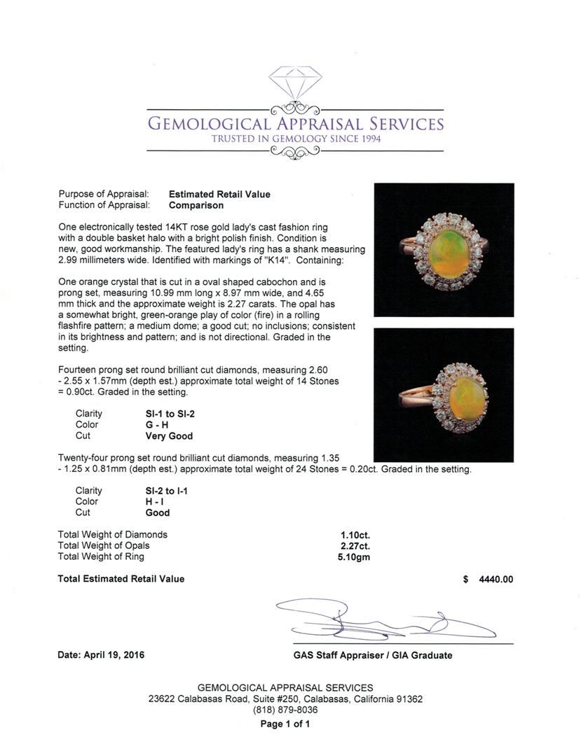 One electronically tested 14KT rose gold lady's cast fashion ring with a double basket halo with a bright polish finish. The featured lady's ring has a shank measuring 2.99 millimeters wide. Identified with markings of "K14". Condition is new, good workmanship. Containing: One orange crystal that is cut in a oval shaped cabochon and is prong set, measuring 10.99 mm long x 8.97 mm wide, and 4.65 mm thick and the approximate weight is 2.27 carats. The opal has a somewhat bright, green-orange play of color (fire) in a rolling flashfire pattern; a medium dome; a good cut; no inclusions; consistent in its brightness and pattern; and is not directional. Graded in the setting. Fourteen prong set round brilliant cut diamonds, measuring 2.60 - 2.55 x 1.57mm (depth est.) approximate total weight of 14 Stones = 0.90ct. Graded in the setting. Clarity: SI-1 to SI-2. Color: G - Very Good Twenty-Four prong set round brilliant cut diamonds, measuring 1.35 - 1.25 x 0.81mm (depth est.) approximate total weight of 24 Stones = 0.20ct. Graded in the setting. Clarity: SI-2 to I-1. Color: H - I. Cut Good. Total Weight of Diamonds 1.10ct. Total Weight of Opals 2.27ct. Total Weight of Ring 5.10gm. GAS Appraised at $4,440.00.