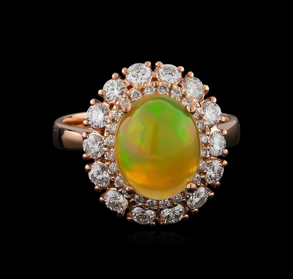One electronically tested 14KT rose gold lady's cast fashion ring with a double basket halo with a bright polish finish. The featured lady's ring has a shank measuring 2.99 millimeters wide. Identified with markings of "K14". Condition is new, good workmanship. Containing: One orange crystal that is cut in a oval shaped cabochon and is prong set, measuring 10.99 mm long x 8.97 mm wide, and 4.65 mm thick and the approximate weight is 2.27 carats. The opal has a somewhat bright, green-orange play of color (fire) in a rolling flashfire pattern; a medium dome; a good cut; no inclusions; consistent in its brightness and pattern; and is not directional. Graded in the setting. Fourteen prong set round brilliant cut diamonds, measuring 2.60 - 2.55 x 1.57mm (depth est.) approximate total weight of 14 Stones = 0.90ct. Graded in the setting. Clarity: SI-1 to SI-2. Color: G - Very Good Twenty-Four prong set round brilliant cut diamonds, measuring 1.35 - 1.25 x 0.81mm (depth est.) approximate total weight of 24 Stones = 0.20ct. Graded in the setting. Clarity: SI-2 to I-1. Color: H - I. Cut Good. Total Weight of Diamonds 1.10ct. Total Weight of Opals 2.27ct. Total Weight of Ring 5.10gm. GAS Appraised at $4,440.00.