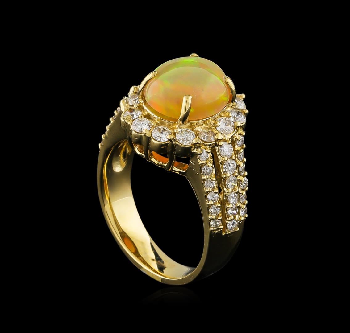 One electronically tested 14KT yellow gold lady's cast fashion ring with a three row basket halo with a bright polish finish. The featured lady's ring has a shank measuring 3.93 millimeters wide. Identified with markings of "K14". Condition is new, good workmanship. Containing: One orange crystal that is cut in a oval shaped cabochon and is prong set, measuring 11.03 mm long x 9.10 mm wide, and 4.56 mm thick and the approximate weight is 2.27 carats. The opal has a bright, orange-green play of color (fire) in a rolling flashfire pattern; a medium dome; a good cut; no inclusions; slight variation in base in its brightness and pattern; and is slightly directional. Graded in the setting. Fourteen prong set round brilliant cut diamonds, measuring 2.40 - 2.30 x 1.46mm (depth est.) approximate total weight of 14 Stones = 0.70ct. Graded in the setting. Clarity: SI-1 to SI-2. Color: H - I. Cut Very Good Twelve prong set round brilliant cut diamonds, measuring 1.90 - 1.80 x 1.13mm (depth est.) approximate total weight of 12 Stones = 0.28ct. Graded in the setting. Clarity: SI-1 to SI-2. Color: H - I. Cut Good Twenty-Four prong set round brilliant cut diamonds, measuring 1.50 - 1.45 x 0.92mm (depth est.) approximate total weight of 24 Stones = 0.30ct. Graded in the setting. Clarity: SI-1 to I-1. Color: H - I. Cut Good. Total Weight of Diamonds 1.28ct. Total Weight of Opals 2.27ct. Total Weight of Ring 8.20gm. GAS Appraised at $5,010.00.