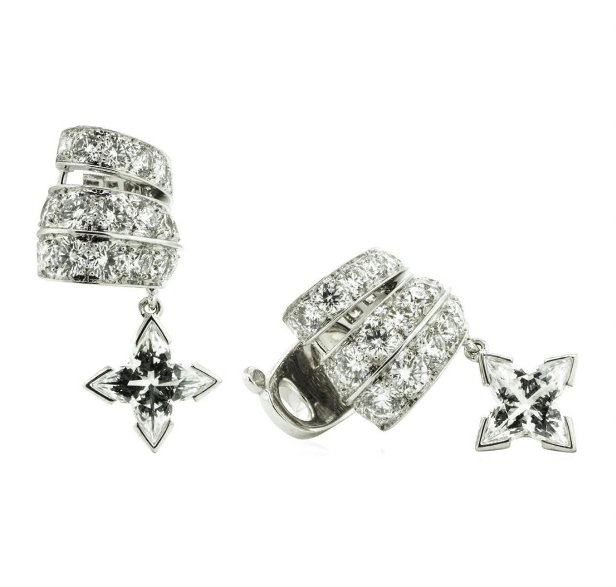One prong set princess cut diamond, measuring 5.50 x 5.50 x 4.10mm (depth est.) approximate weight of 1.02ct. The featured diamond is a modified Princess cut to a four-pointed star. Graded in the setting. Color G Clarity VS-1 Cut Very Good Thirty-Four bead set round brilliant cut diamonds, measuring 3.00 - 1.60 x 1.41mm (depth est.) approximate total weight of 34 Stones = 1.25ct. Graded in the setting. Color E - F Clarity VVS-2 to VS-2 Cut Ideal. Total Weight of Diamonds 2.27ct.. Total Weight of Ear Cuff 5.30gm GAS Appraised at $21965.00. GAS Appraised.