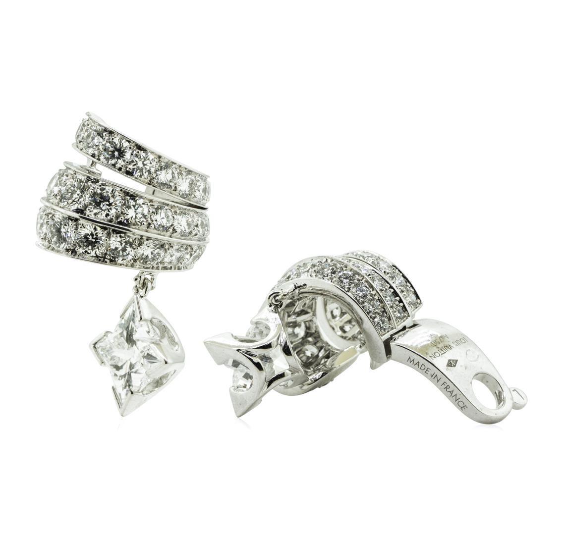 One prong set princess cut diamond, measuring 5.50 x 5.50 x 4.10mm (depth est.) approximate weight of 1.02ct. The featured diamond is a modified Princess cut to a four-pointed star. Graded in the setting. Color G Clarity VS-1 Cut Very Good Thirty-Four bead set round brilliant cut diamonds, measuring 3.00 - 1.60 x 1.41mm (depth est.) approximate total weight of 34 Stones = 1.25ct. Graded in the setting. Color E - F Clarity VVS-2 to VS-2 Cut Ideal. Total Weight of Diamonds 2.27ct.. Total Weight of Ear Cuff 5.30gm GAS Appraised at $21965.00. GAS Appraised.