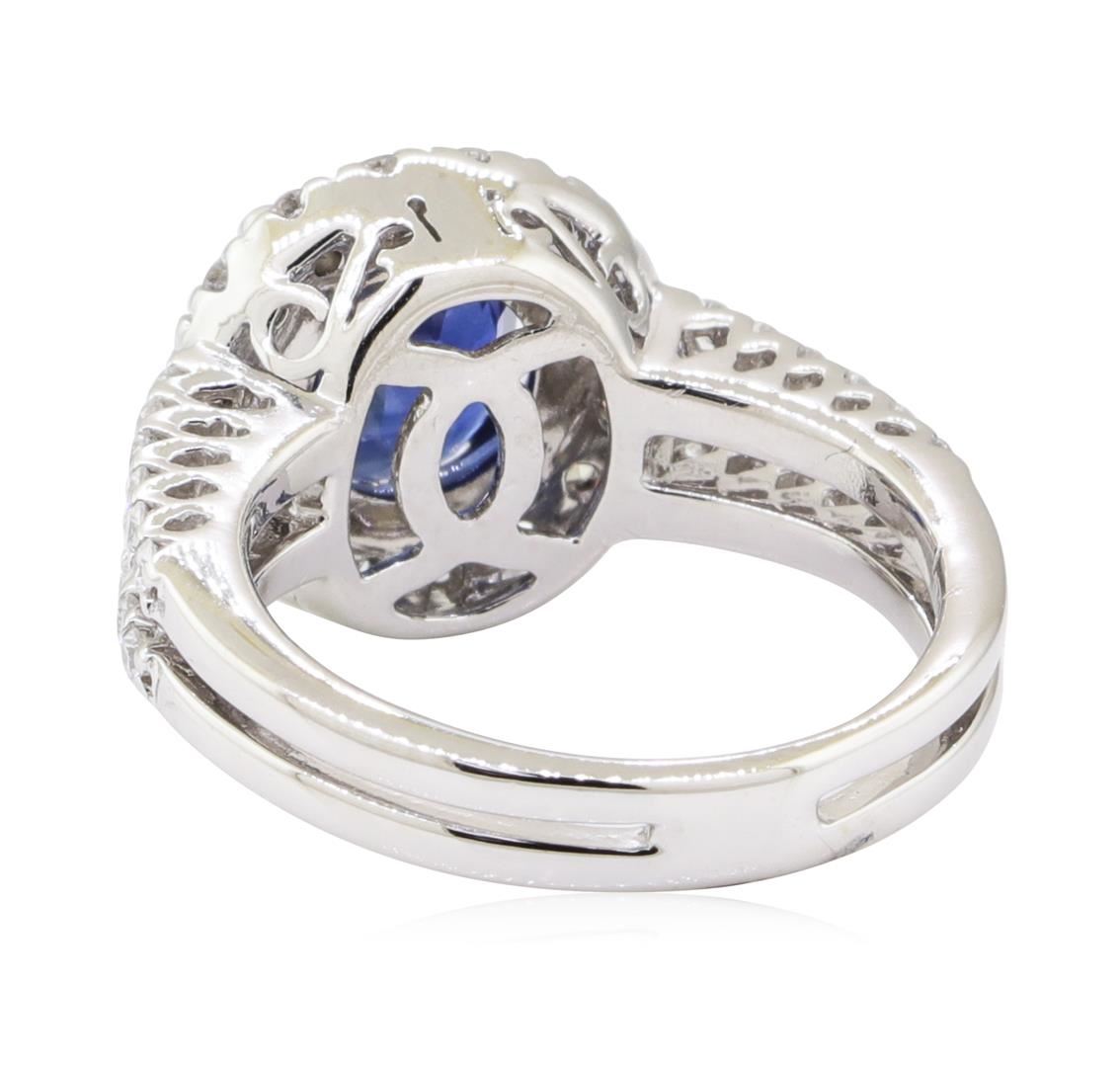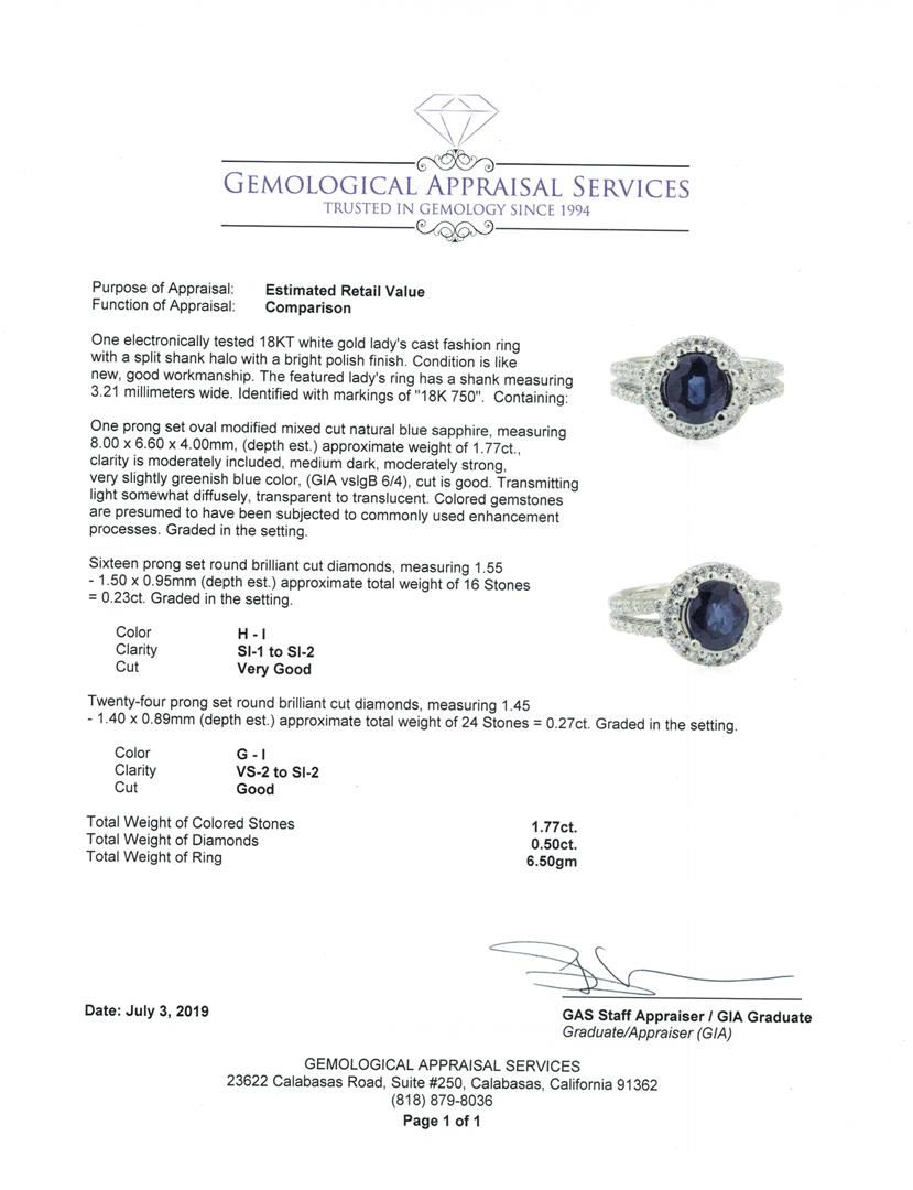 One electronically tested 18KT white gold lady's cast fashion ring with a split shank halo with a bright polish finish. The featured lady's ring has a shank measuring 3.21 millimeters wide. Identified with markings of '18K 750'. Condition is like new, good workmanship. Containing: One prong set oval modified mixed cut natural blue sapphire, measuring 8.00 x 6.60 x 4.00mm, (depth est.) approximate weight of 1.77ct., clarity is moderately included, medium dark, moderately strong, very slightly greenish blue color, (GIA vslgB 6/4), cut is good. Transmitting light somewhat diffusely, transparent to translucent. Colored gemstones are presumed to have been subjected to commonly used enhancement processes. Graded in the setting. Sixteen prong set round brilliant cut diamonds, measuring 1.55 - 1.50 x 0.95mm (depth est.) approximate total weight of 16 Stones = 0.23ct. Graded in the setting. Color H - I Clarity SI-1 to SI-2 Cut Very Good Twenty-Four prong set round brilliant cut diamonds, measuring 1.45 - 1.40 x 0.89mm (depth est.) approximate total weight of 24 Stones = 0.27ct. Graded in the setting. Color G - I Clarity VS-2 to SI-2 Cut Good. Total Weight of Colored Stones 1.77ct.. Total Weight of Diamonds 0.50ct.. Total Weight of Ring 6.50gm GAS Appraised at $3930.00. GAS Appraised at $3,930.00.