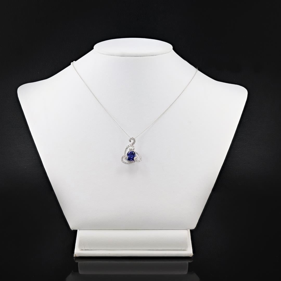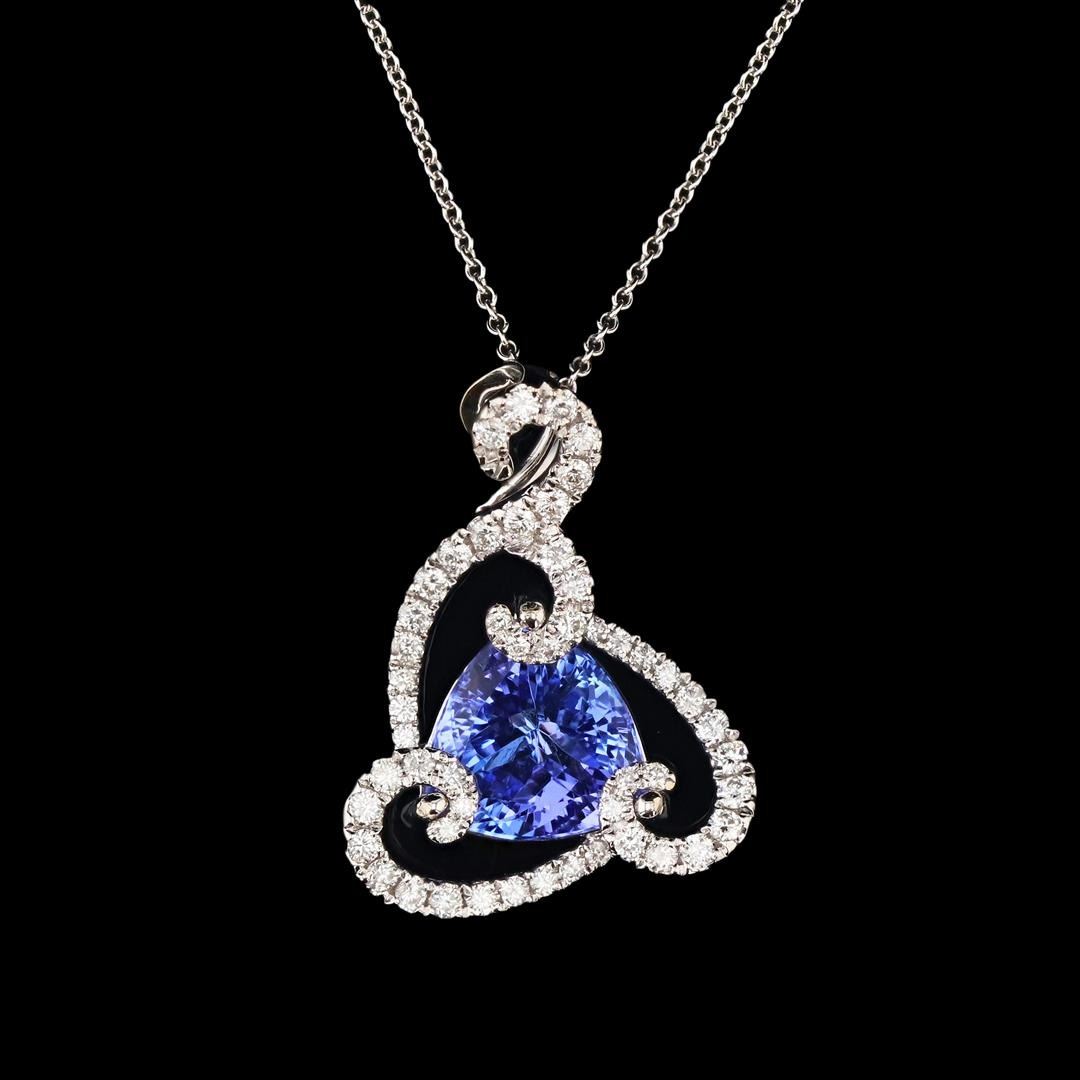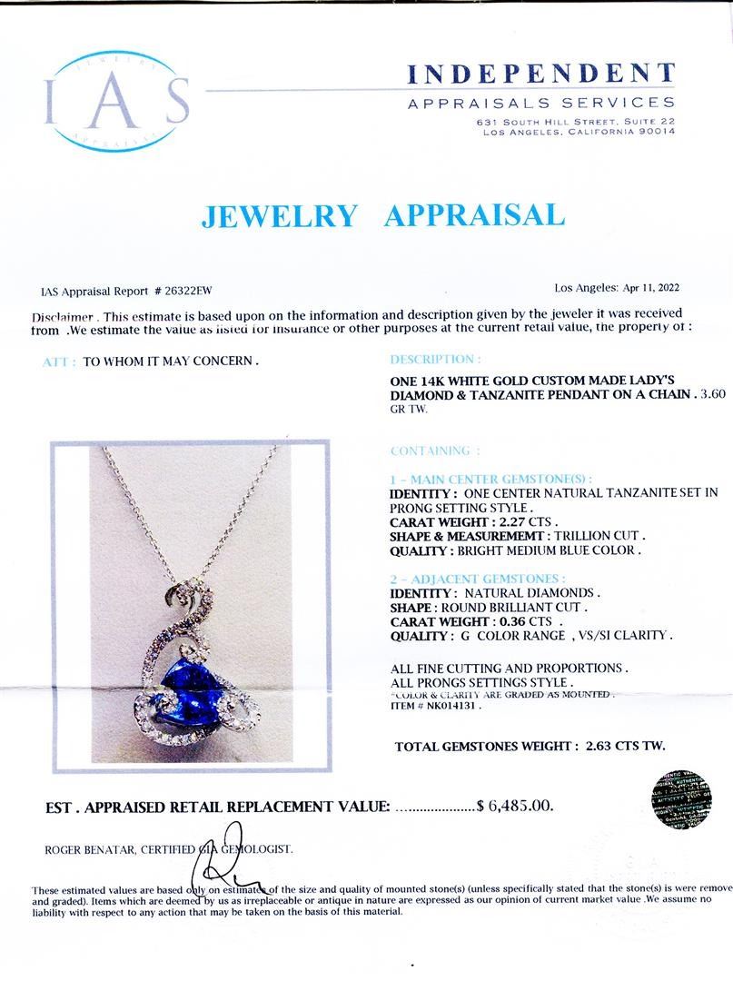 2.27ct Tanzanite and 0.36ctw Diamond 14K White Gold Pendant. DESCRIPTION : ONE 14K WHITE GOLD CUSTOM MADE LADY'S DIAMOND and TANZANITE PENDANT ON A CHAIN . 3.60 GR TW 1 - MAIN CENTER GEMSTONE(S) IDENTITY: ONE CENTER NATURAL TANZANITE SET IN PRONG SETTING STYLE CARAT WEIGHT: 2.27 CTS SHAPE and MEASUREMEMT: TRILLION CUT QUALITY: BRIGHT MEDIUM BLUE COLOR 2 - ADJACENT GEMSTONES: IDENTITY: NATURAL DIAMONDS SHAPE: ROUND BRILLIANT CUT CARAT WEIGHT: 0.36 CTS QUALITY: G COLOR RANGE , VS/SI CLARITY ALL FINE CUTTING AND PROPORTIONS ALL PRONGS SETTINGS STYLE TOTAL GEMSTONES WEIGHT: 2.63 CTS TW.