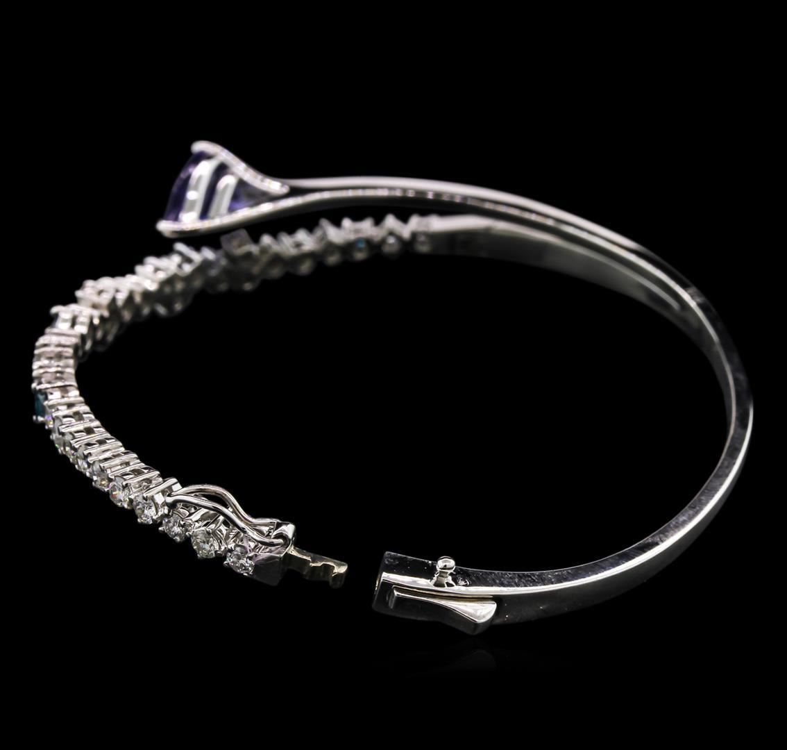 One electronically tested 14KT white gold lady's combination cast & assembled fashion bangle bracelet with a tongue clasp with foldover safety with a bright polish finish. Condition is new, good workmanship. Containing: One prong set pear modified brilliant cut natural tanzanite, measuring 11.00 x 7.35 x 4.30mm, approximate weight of 2.27ct., clarity is eye clean, type I, medium light, very slightly grayish, bluish violet color, (GIA bV 4/3), cut is good. Transmitting light with no distortion, transparent. Colored gemstones are presumed to have been subjected to commonly used enhancement processes. Graded in the setting. Two prong set round brilliant cut diamonds, measuring 3.30 - 3.25 x 1.97mm (depth est.) approximate total weight of 2 Stones = 0.23ct. Colored gemstones are presumed to have been subjected to commonly used enhancement processes. Graded in the setting. Clarity: SI-2 to I-1 Cut Good Thirty-Two prong set round brilliant cut diamonds, measuring 2.50 - 2.20 x 1.41mm (depth est.) approximate total weight of 32 Stones = 1.52ct. Graded in the setting. Clarity: SI-2 to I-1. Color: H - Good. Total Weight of Colored Stones 2.27ct. Total Weight of Diamonds 1.75ct. Total Weight of Bangle Bracelet 16.90gm.