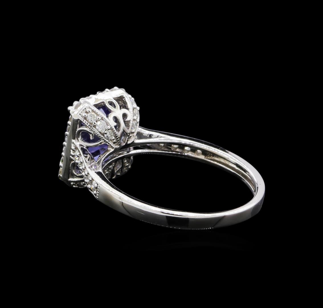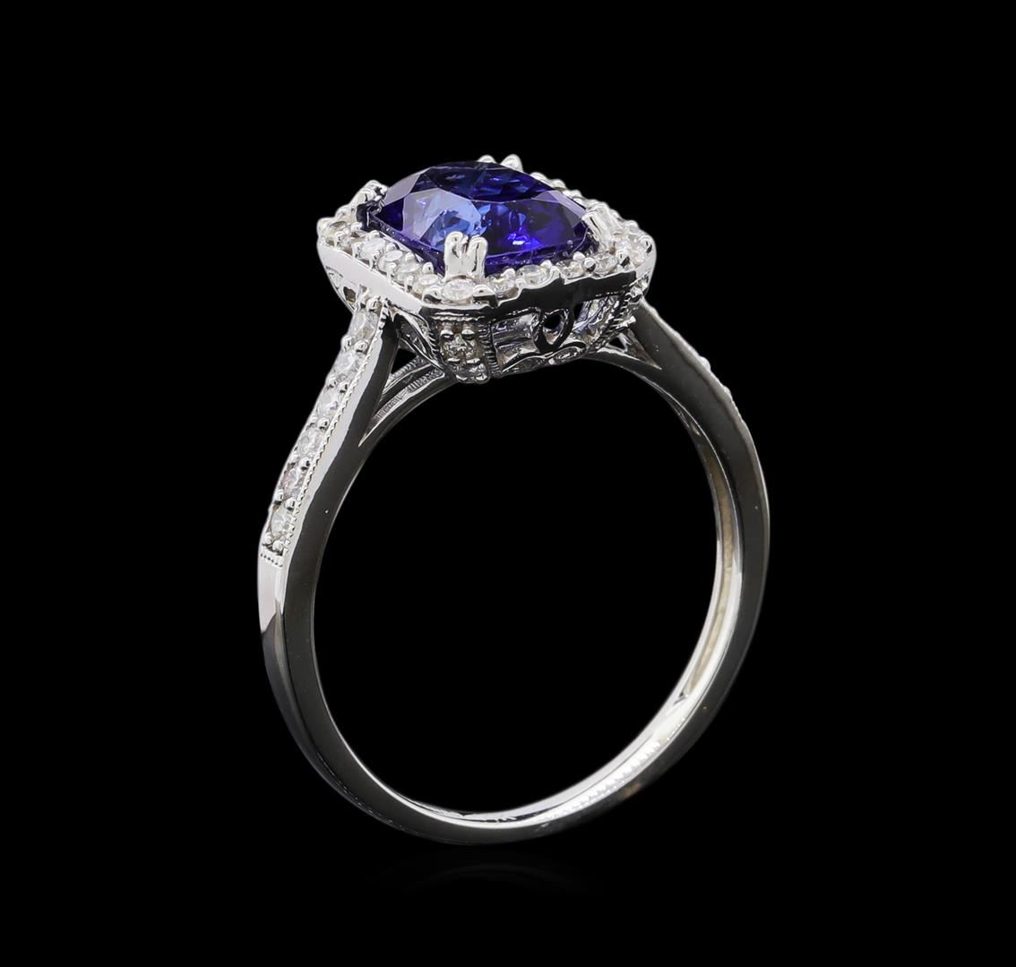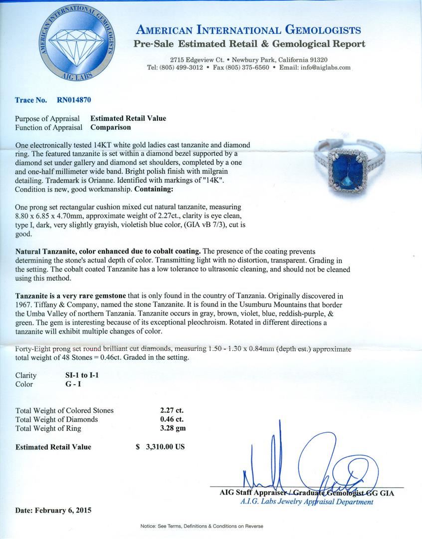 One electronically tested 14KT white gold ladies cast tanzanite and diamond ring. The featured tanzanite is set within a diamond bezel supported by a diamond set under gallery and diamond set shoulders, completed by a one and one-half millimeter wide band. Bright polish finish with milgrain detailing. Trademark is Orianne. Identified with markings of "14K". Condition is new, good workmanship. Containing: One prong set rectangular cushion mixed cut natural tanzanite, measuring 8.80 x 6.85 x 4.70mm, approximate weight of 2.27ct., clarity is eye clean, type I, dark, very slightly grayish, violetish blue color, (GIA vB 7/3), cut is good. Natural Tanzanite, color enhanced due to cobalt coating. The presence of the coating prevents determining the stone's actual depth of color. Transmitting light with no distortion, transparent. Grading in the setting. The cobalt coated Tanzanite has a low tolerance to ultrasonic cleaning, and should not be cleaned using this method. Tanzanite is a very rare gemstone that is only found in the country of Tanzania. Originally discovered in 1967. Tiffany & Company, named the stone Tanzanite. It is found in the Usumburu Mountains that border the Umba Valley of northern Tanzania. Tanzanite occurs in gray, brown, violet, blue, reddish-purple, & green. The gem is interesting because of its exceptional pleochroism. Rotated in different directions a tanzanite will exhibit multiple changes of color. Forty-Eight prong set round brilliant cut diamonds, measuring 1.50 - 1.30 x 0.84mm (depth est.) approximate total weight of 48 Stones = 0.46ct. Graded in the setting. Clarity: SI-1 to I-1. Color: G - I. Total Weight of Colored Stones 2.27ct. Total Weight of Diamonds 0.46ct. Total Weight of Ring 3.28gm. AIG Appraised at $3,310.00.