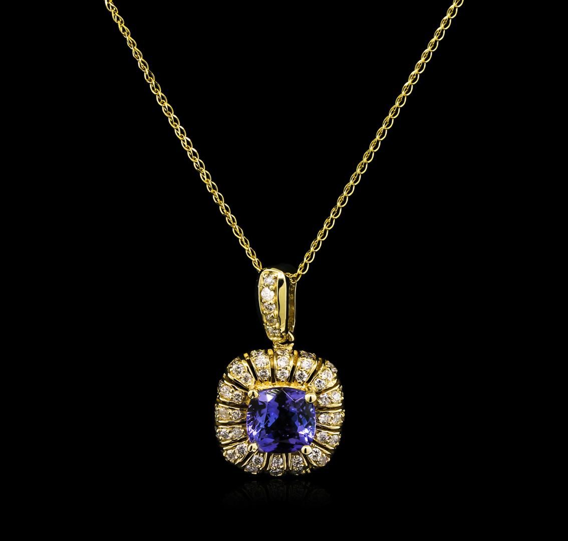 One electronically tested 14KT yellow gold lady's combination cast & assembled fashion pendant & chain 18.0" long, 1mm loose rope chain with a spring ring clasp with a halo with a bright polish finish. Identified with markings of "14K". Condition is new, good workmanship. Containing: One prong set square cushion modified brilliant cut natural tanzanite, measuring 7.82 x 7.79 x 5.00mm, approximate weight of 2.27ct., clarity is eye clean, type I, medium, very slightly grayish, bluish violet color, (GIA bV 5/3), cut is good. Transmitting light with no distortion, transparent. Colored gemstones are presumed to have been subjected to commonly used enhancement processes. Graded in the setting. Fifty-Three prong set round brilliant cut diamonds, measuring 1.50 - 1.35 x 0.93mm (depth est.) approximate total weight of 53 Stones = 0.61ct. Graded in the setting. Clarity: SI-2 to I-1. Color: H - I. Cut Good. Total Weight of Colored Stones 2.27ct. Total Weight of Diamonds 0.61ct. Total Weight of Pendant & Chain 5.10gm. GAS Appraised at $5,160.00.