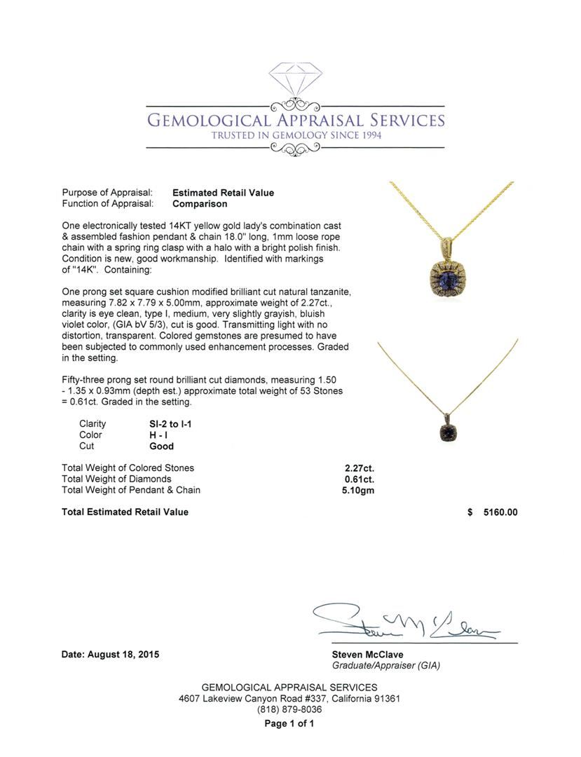 One electronically tested 14KT yellow gold lady's combination cast & assembled fashion pendant & chain 18.0" long, 1mm loose rope chain with a spring ring clasp with a halo with a bright polish finish. Identified with markings of "14K". Condition is new, good workmanship. Containing: One prong set square cushion modified brilliant cut natural tanzanite, measuring 7.82 x 7.79 x 5.00mm, approximate weight of 2.27ct., clarity is eye clean, type I, medium, very slightly grayish, bluish violet color, (GIA bV 5/3), cut is good. Transmitting light with no distortion, transparent. Colored gemstones are presumed to have been subjected to commonly used enhancement processes. Graded in the setting. Fifty-Three prong set round brilliant cut diamonds, measuring 1.50 - 1.35 x 0.93mm (depth est.) approximate total weight of 53 Stones = 0.61ct. Graded in the setting. Clarity: SI-2 to I-1. Color: H - I. Cut Good. Total Weight of Colored Stones 2.27ct. Total Weight of Diamonds 0.61ct. Total Weight of Pendant & Chain 5.10gm. GAS Appraised at $5,160.00.