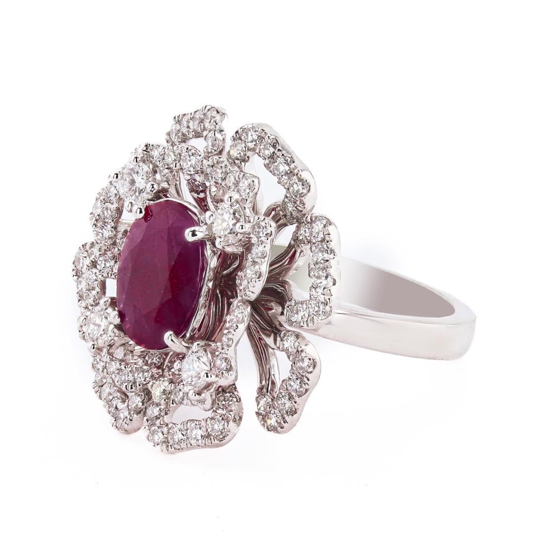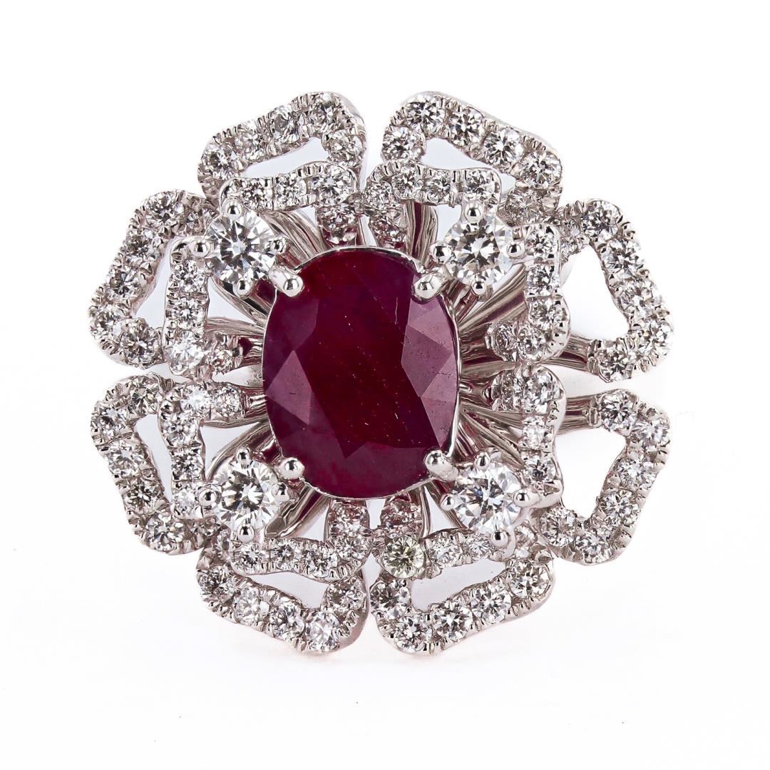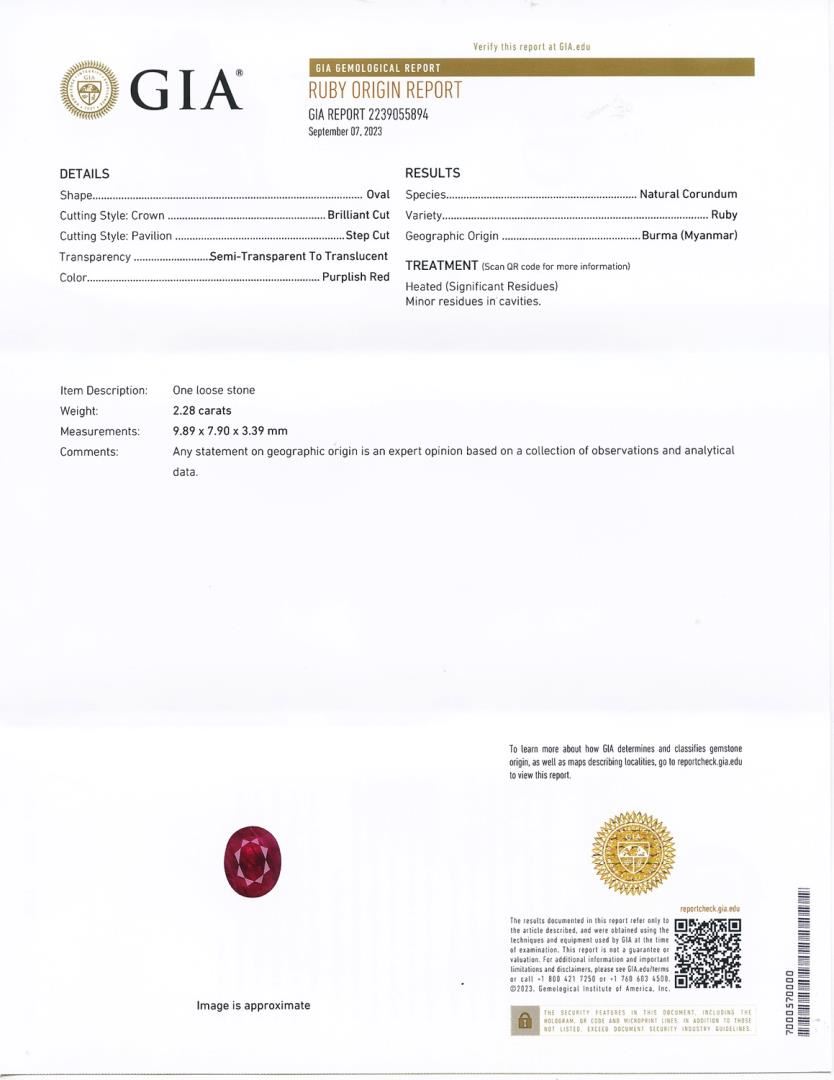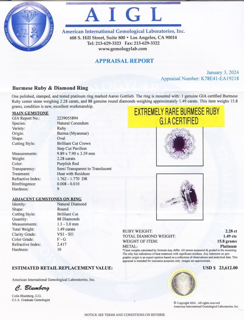 One polished, stamped, and tested platinum ring marked Aaron Gottlieb. The ring is mounted with: 1 genuine GIA certified Burmese Ruby center stone weighing 2.28 carats, and 88 genuine round diamonds weighing approximately 1.49 carats. This item weighs 15.8 grams, condition is new, excellent workmanship. #MAIN GEMSTONE# GIA Report No.: 2239055894 Species: Natural Corundum Variety: Ruby Origin: Burma (Myanmar) Shape: Oval Cutting Style: Brilliant Cut Crown Step Cut Pavilion Measurements: 9.89 x 7.90 x 3.39mm Weight: 2.28 carats Color: Purplish Red Transparency: Semi Transparent to Translucent Treatment: Heat with Residues Refractive Index: 1.762 - 1.770 DR Birefringence: 0.008 - 0.010 Hardness: 9 #ADJACENT GEMSTONES ON RING# Identity: Natural Diamond Shape: Round Cutting Style: Brilliant Cut Quantity: 88 Diamonds Measurements: 1.3 - 3.0mm Total Weight: 1.49 carats Clarity Grade: VS1 - SI1 Color Grade: F - G Refractive Index: 2.417 Hardness: 10 RUBY WEIGHT: 2.28 ct TOTAL DIAMOND WEIGHT: 1.49 cts WEIGHT OF ITEM: 15.8 grams METAL: Platinum