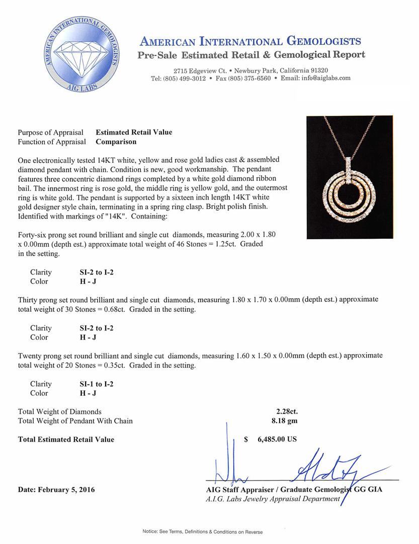 One electronically tested 14KT white, yellow and rose gold ladies cast & assembled diamond pendant with chain. The pendant features three concentric diamond rings completed by a white gold diamond ribbon bail. The innermost ring is rose gold, the middle ring is yellow gold, and the outermost ring is white gold. The pendant is supported by a sixteen inch length 14KT white gold designer style chain, terminating in a spring ring clasp. Bright polish finish. Identified with markings of "14K". Condition is new, good workmanship. Containing: Forty-Six prong set round brilliant and single cut diamonds, measuring 2.00 x 1.80 x 0.00mm (depth est.) approximate total weight of 46 Stones = 1.25ct. Graded in the setting. Clarity: SI-2 to I-2. Color: H - J Thirty prong set round brilliant and single cut diamonds, measuring 1.80 x 1.70 x 0.00mm (depth est.) approximate total weight of 30 Stones = 0.68ct. Graded in the setting. Clarity: SI-2 to I-2. Color: H - J Twenty prong set round brilliant and single cut diamonds, measuring 1.60 x 1.50 x 0.00mm (depth est.) approximate total weight of 20 Stones = 0.35ct. Graded in the setting. Clarity: SI-1 to I-2. Color: H - J. Total Weight of Diamonds 2.28ct. Total Weight of Pendant With Chain 8.18gm. AIG Appraised at $6,485.00.
