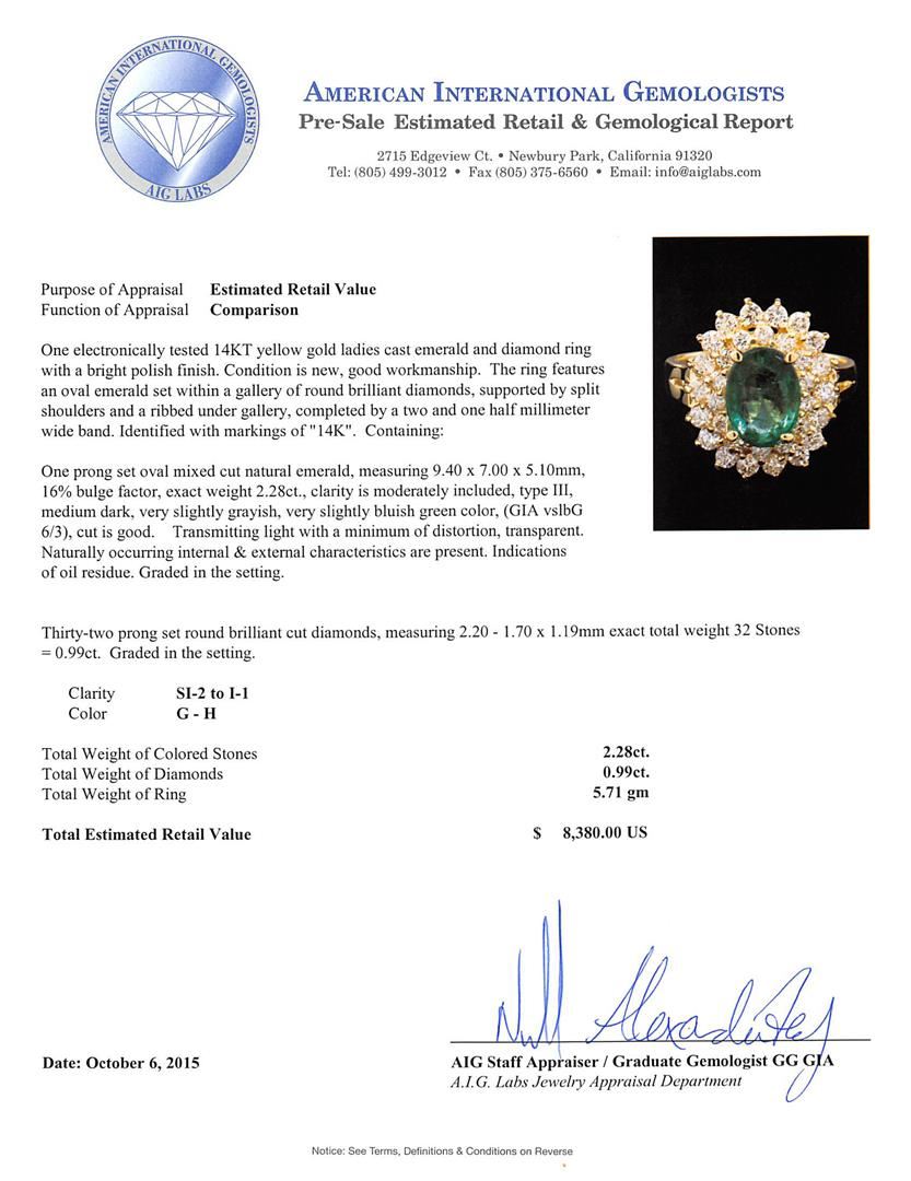 One electronically tested 14KT yellow gold ladies cast emerald and diamond ring with a bright polish finish. The ring features an oval emerald set within a gallery of round brilliant diamonds, supported by split shoulders and a ribbed under gallery, completed by a two and one half millimeter wide band. Identified with markings of "14K". Condition is new, good workmanship. Containing: One prong set oval mixed cut natural emerald, measuring 9.40 x 7.00 x 5.10mm, 16% bulge factor, exact weight 2.28ct., clarity is moderately included, type III, medium dark, very slightly grayish, very slightly bluish green color, (GIA vslbG 6/3), cut is good. Transmitting light with a minimum of distortion, transparent. Naturally occurring internal & external characteristics are present. Indications of oil residue. Graded in the setting. Thirty-Two prong set round brilliant cut diamonds, measuring 2.20 - 1.70 x 1.19mm exact total weight 32 Stones = 0.99ct. Graded in the setting. Clarity: SI-2 to I-1. Color: G - H. Total Weight of Colored Stones 2.28ct. Total Weight of Diamonds 0.99ct. Total Weight of Ring 5.71gm. AIG Appraised at $8,380.00.