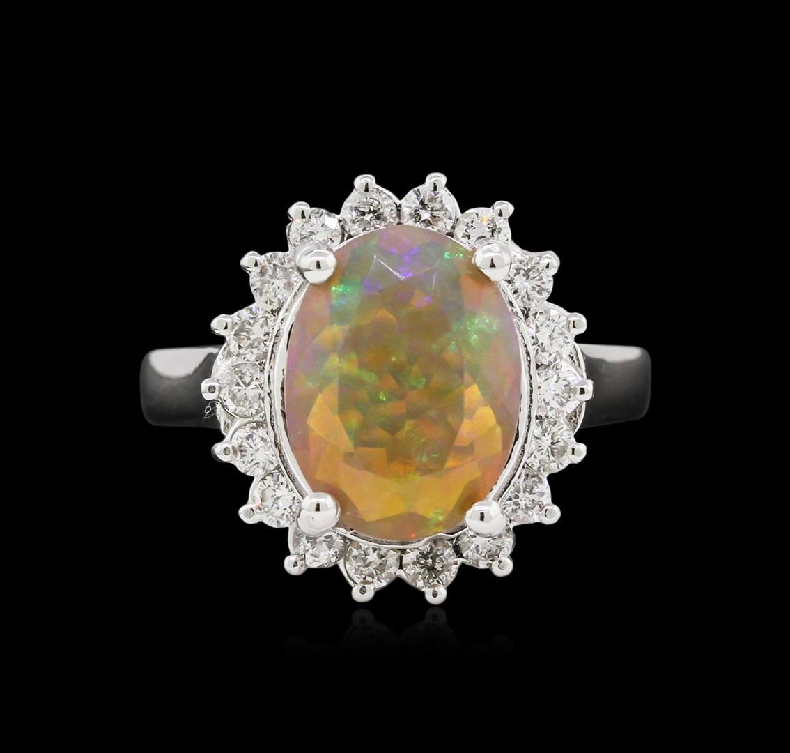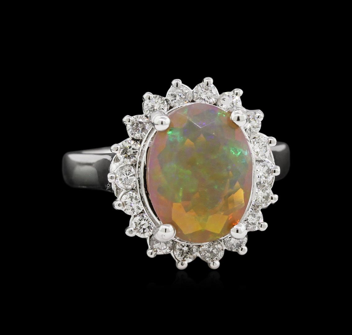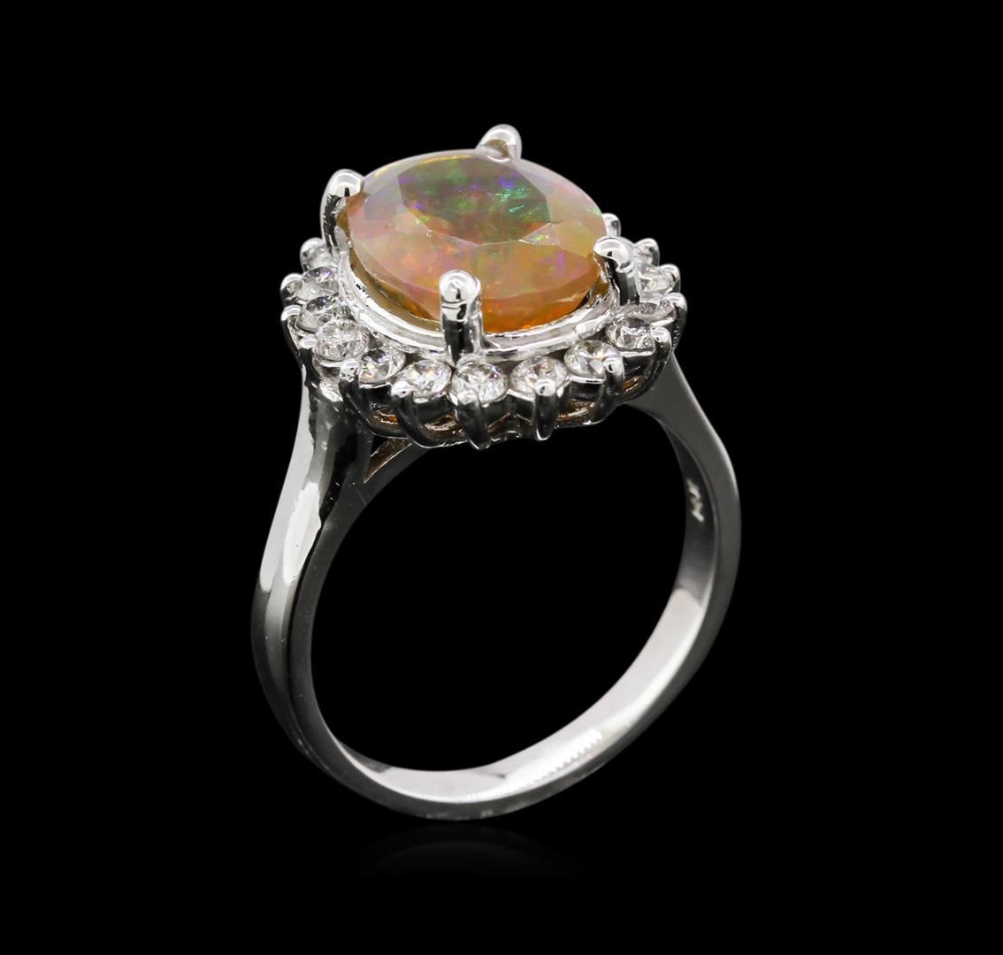 One 14K White Gold Lady's Ring. 6.10 GR. Containing: Main Gemstones: Identity: Opal. Carat Weight 2.28 CTS TW. Shape & Measurement: Oval Faceted. Quality: Fine Peach Color. Adjacent Gemstones: Identity: Natural Diamond. Shape: Round Cut. Carat Weight: 0.66 CTS TW. Quality: SI Clarity, G-H Color. All Fine Cutting And Proportions. Total Gemstones Weight: 2.94 CTW TW. RBGS Appraised.