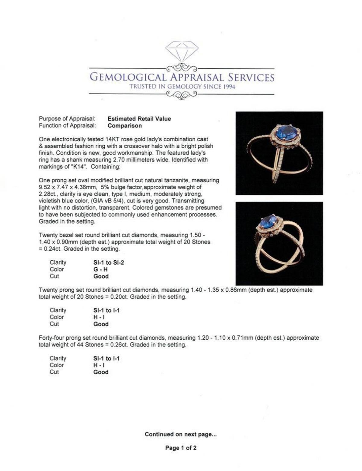 One electronically tested 14KT rose gold lady's combination cast & assembled fashion ring with a crossover halo with a bright polish finish. The featured lady's ring has a shank measuring 2.70 millimeters wide. Identified with markings of "K14". Condition is new, good workmanship. Containing: One prong set oval modified brilliant cut natural tanzanite, measuring 9.52 x 7.47 x 4.36mm, 5%. bulge factor, approximate weight of 2.28ct., clarity is eye clean, type I, medium, moderately strong, violetish blue color, (GIA vB 5/4), cut is very good. Transmitting light with no distortion, transparent. Colored gemstones are presumed to have been subjected to commonly used enhancement processes. Graded in the setting. Twenty bezel set round brilliant cut diamonds, measuring 1.50 - 1.40 x 0.90mm (depth est.) approximate total weight of 20 Stones = 0.24ct. Graded in the setting. Clarity: SI-1 to SI-2. Color: G - Good Twenty prong set round brilliant cut diamonds, measuring 1.40 - 1.35 x 0.86mm (depth est.) approximate total weight of 20 Stones = 0.20ct. Graded in the setting. Clarity: SI-1 to I-1. Color: H - I. Cut Good Forty-Four prong set round brilliant cut diamonds, measuring 1.20 - 1.10 x 0.71mm (depth est.) approximate total weight of 44 Stones = 0.26ct. Graded in the setting. Clarity: SI-1 to I-1. Color: H - I. Cut Good. Total Weight of Colored Stones 2.28ct. Total Weight of Diamonds 0.70ct. Total Weight of Ring 5.10gm. GAS Appraised.
