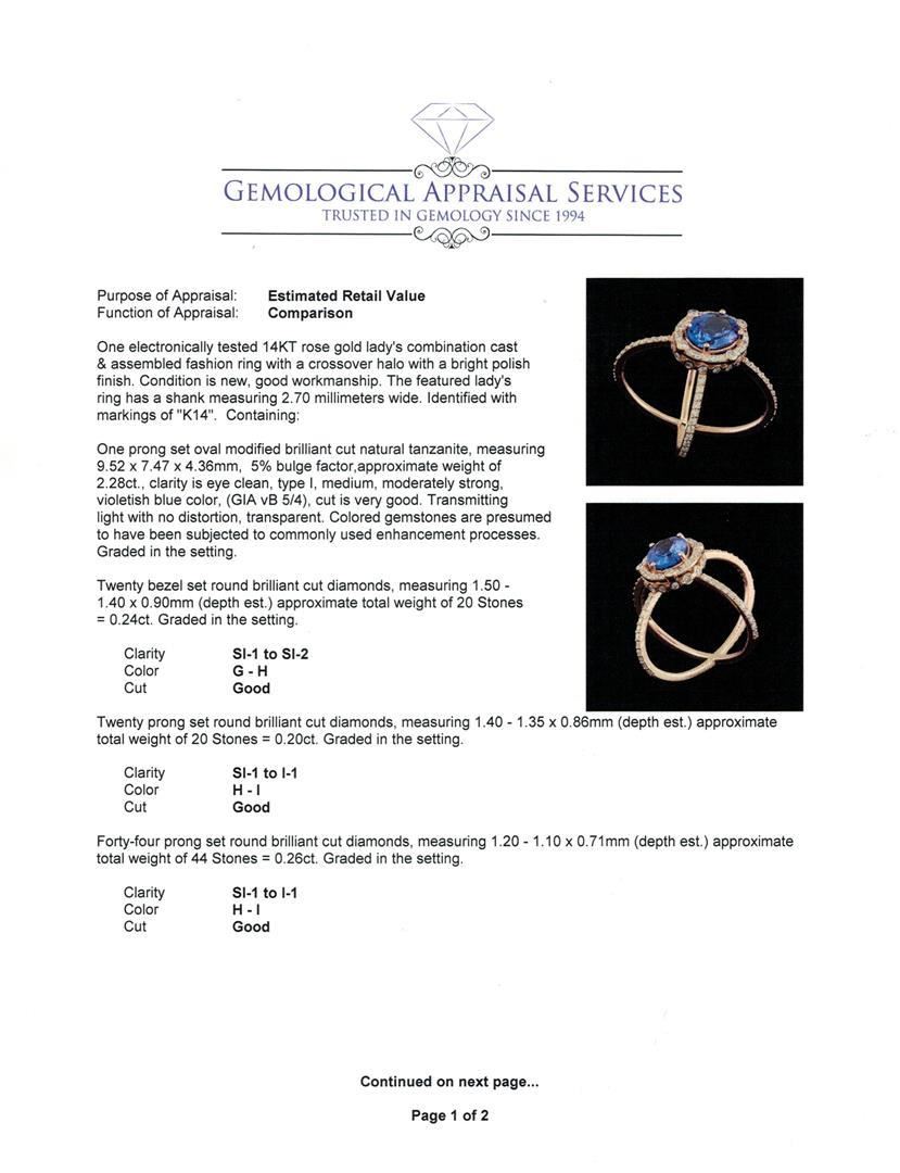 One electronically tested 14KT rose gold lady's combination cast & assembled fashion ring with a crossover halo with a bright polish finish. The featured lady's ring has a shank measuring 2.70 millimeters wide. Identified with markings of "K14". Condition is new, good workmanship. Containing: One prong set oval modified brilliant cut natural tanzanite, measuring 9.52 x 7.47 x 4.36mm, 5%. bulge factor, approximate weight of 2.28ct., clarity is eye clean, type I, medium, moderately strong, violetish blue color, (GIA vB 5/4), cut is very good. Transmitting light with no distortion, transparent. Colored gemstones are presumed to have been subjected to commonly used enhancement processes. Graded in the setting. Twenty bezel set round brilliant cut diamonds, measuring 1.50 - 1.40 x 0.90mm (depth est.) approximate total weight of 20 Stones = 0.24ct. Graded in the setting. Clarity: SI-1 to SI-2. Color: G - Good Twenty prong set round brilliant cut diamonds, measuring 1.40 - 1.35 x 0.86mm (depth est.) approximate total weight of 20 Stones = 0.20 ct. Graded in the setting. Clarity: SI-1 to I-1. Color: H - I. Cut Good Forty-Four prong set round brilliant cut diamonds, measuring 1.20 - 1.10 x 0.71mm (depth est.) approximate total weight of 44 Stones = 0.26ct. Graded in the setting. Clarity: SI-1 to I-1. Color: H - I. Cut Good. Total Weight of Colored Stones 2.28ct. Total Weight of Diamonds 0.70 ct. Total Weight of Ring 5.10gm. GAS Appraised.