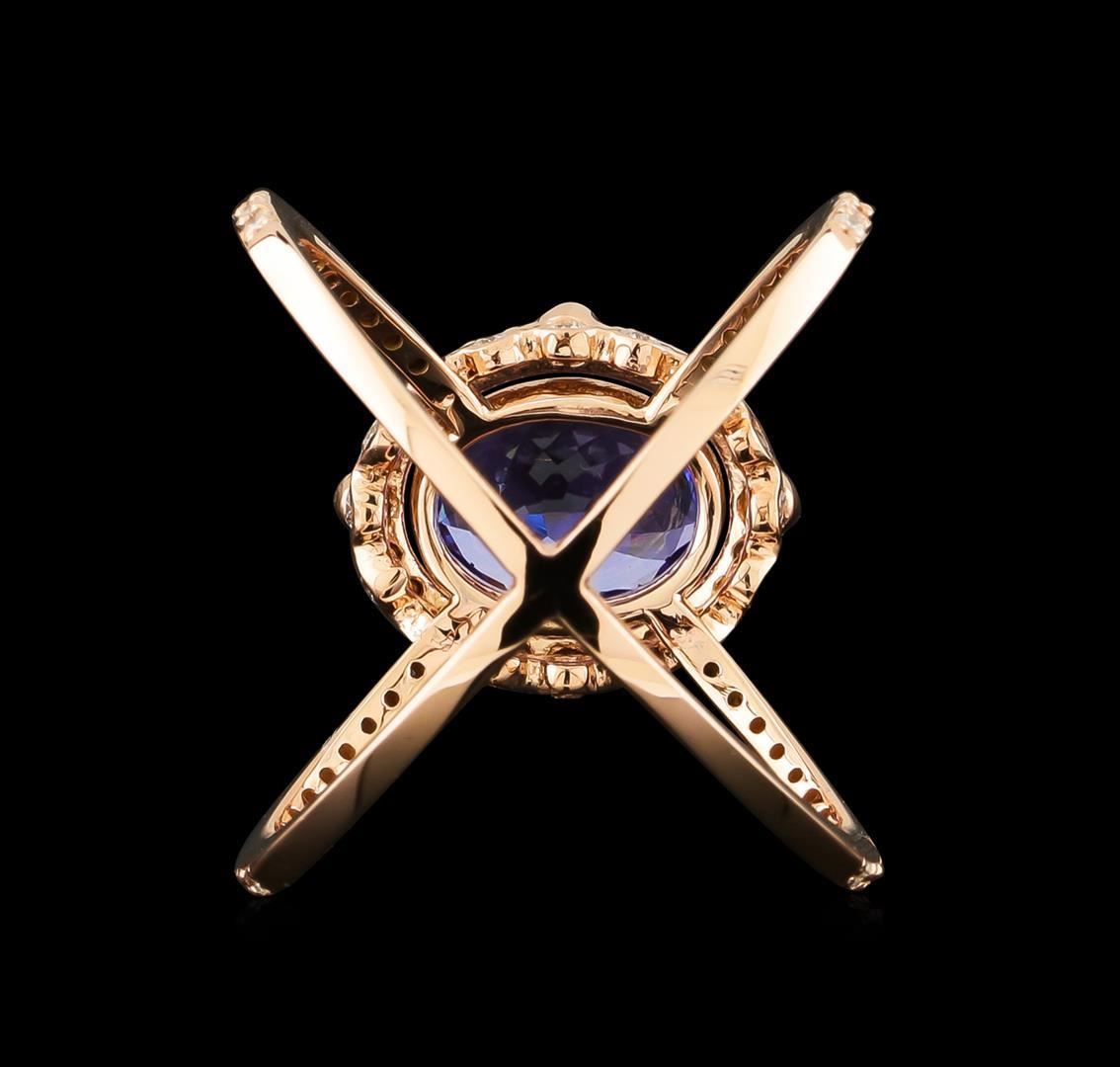 One electronically tested 14KT rose gold lady's combination cast & assembled fashion ring with a crossover halo with a bright polish finish. The featured lady's ring has a shank measuring 2.70 millimeters wide. Identified with markings of "K14". Condition is new, good workmanship. Containing: One prong set oval modified brilliant cut natural tanzanite, measuring 9.52 x 7.47 x 4.36mm, 5%. bulge factor, approximate weight of 2.28ct., clarity is eye clean, type I, medium, moderately strong, violetish blue color, (GIA vB 5/4), cut is very good. Transmitting light with no distortion, transparent. Colored gemstones are presumed to have been subjected to commonly used enhancement processes. Graded in the setting. Twenty bezel set round brilliant cut diamonds, measuring 1.50 - 1.40 x 0.90mm (depth est.) approximate total weight of 20 Stones = 0.24ct. Graded in the setting. Clarity: SI-1 to SI-2. Color: G - Good Twenty prong set round brilliant cut diamonds, measuring 1.40 - 1.35 x 0.86mm (depth est.) approximate total weight of 20 Stones = 0.20 ct. Graded in the setting. Clarity: SI-1 to I-1. Color: H - I. Cut Good Forty-Four prong set round brilliant cut diamonds, measuring 1.20 - 1.10 x 0.71mm (depth est.) approximate total weight of 44 Stones = 0.26ct. Graded in the setting. Clarity: SI-1 to I-1. Color: H - I. Cut Good. Total Weight of Colored Stones 2.28ct. Total Weight of Diamonds 0.70 ct. Total Weight of Ring 5.10gm. GAS Appraised.