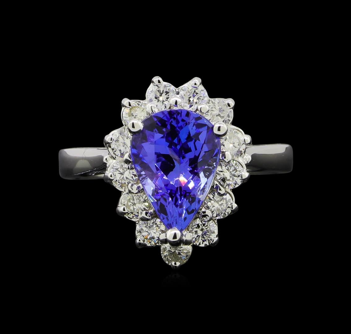One electronically tested 14KT white gold lady's cast fashion ring with a basket halo with a bright polish finish. The featured lady's ring has a shank measuring 2.35 millimeters wide. Identified with markings of 'K14'. Condition is new, good workmanship. Containing: One prong set pear brilliant cut natural tanzanite, measuring 9.89 x 7.06 x 5.31mm, (depth est.) approximate weight of 2.28ct., clarity is eye clean, medium dark, very slightly grayish, violetish blue color, (GIA vB 6/3), cut is very good. Transmitting light with no distortion, transparent. Colored gemstones are presumed to have been subjected to commonly used enhancement processes. Graded in the setting. Thirteen prong set round brilliant cut diamonds, measuring 2.35 - 2.25 x 1.43mm (depth est.) approximate total weight of 13 Stones = 0.60ct. Graded in the setting. Clarity SI-1 to SI-2. Color: H - I Cut Good. Total Weight of Colored Stones 2.28ct.. Total Weight of Diamonds 0.60ct.. Total Weight of Ring 4.50gm. GAS Appraised at $5,465.00.