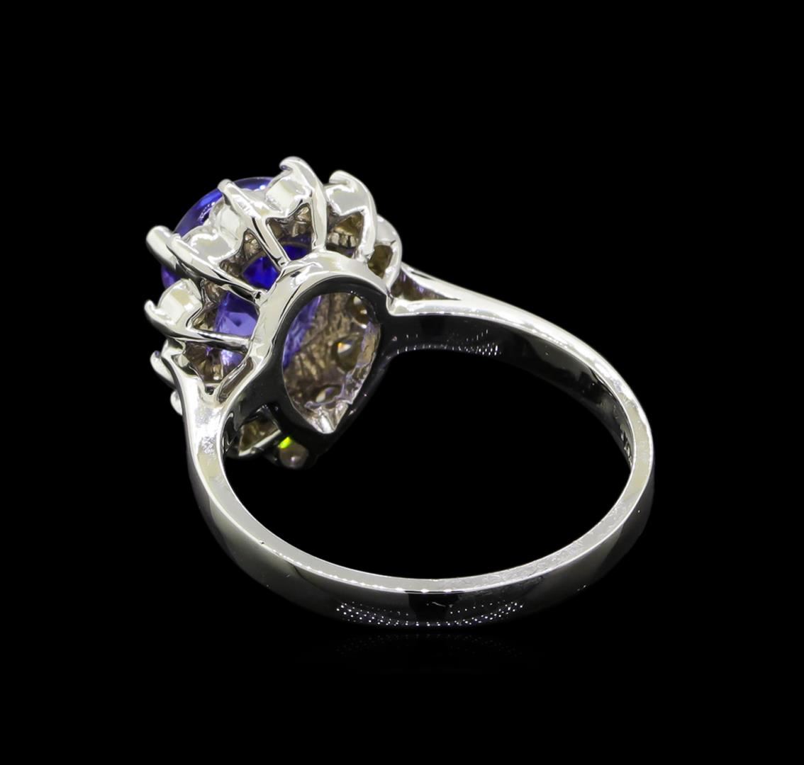 One electronically tested 14KT white gold lady's cast fashion ring with a basket halo with a bright polish finish. The featured lady's ring has a shank measuring 2.35 millimeters wide. Identified with markings of 'K14'. Condition is new, good workmanship. Containing: One prong set pear brilliant cut natural tanzanite, measuring 9.89 x 7.06 x 5.31mm, (depth est.) approximate weight of 2.28ct., clarity is eye clean, medium dark, very slightly grayish, violetish blue color, (GIA vB 6/3), cut is very good. Transmitting light with no distortion, transparent. Colored gemstones are presumed to have been subjected to commonly used enhancement processes. Graded in the setting. Thirteen prong set round brilliant cut diamonds, measuring 2.35 - 2.25 x 1.43mm (depth est.) approximate total weight of 13 Stones = 0.60ct. Graded in the setting. Clarity SI-1 to SI-2. Color: H - I Cut Good. Total Weight of Colored Stones 2.28ct.. Total Weight of Diamonds 0.60ct.. Total Weight of Ring 4.50gm. GAS Appraised at $5,465.00.