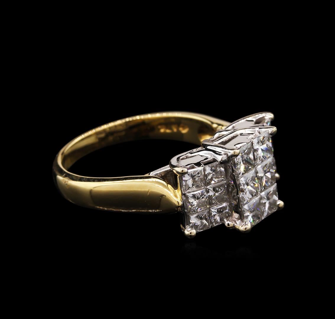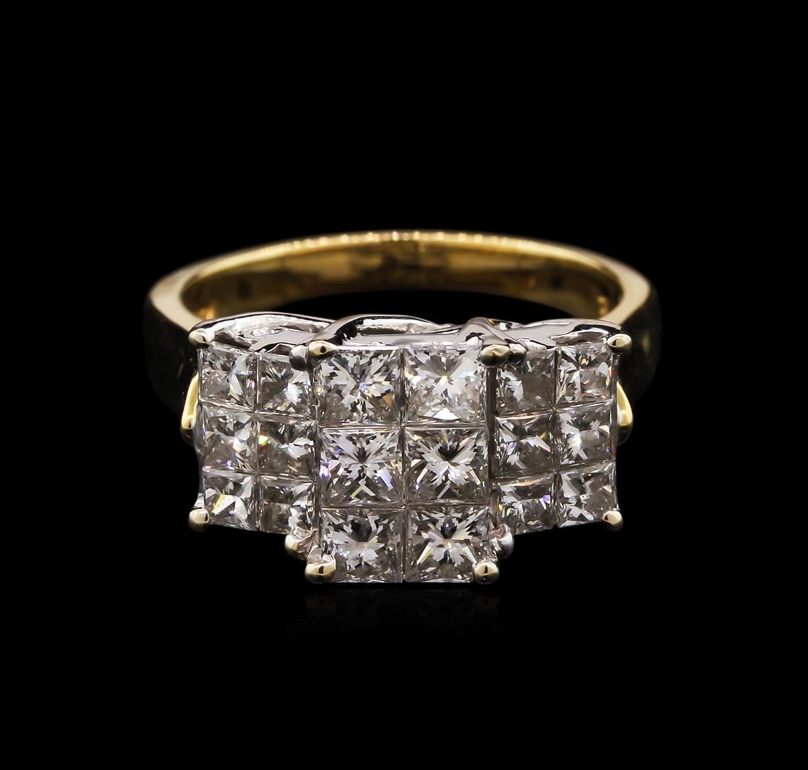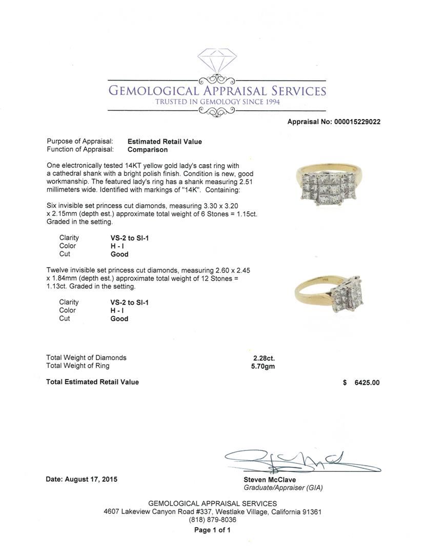 One electronically tested 14KT yellow gold lady's cast ring with a cathedral shank with a bright polish finish. The featured lady's ring has a shank measuring 2.51 millimeters wide. Identified with markings of "14K". Condition is new, good workmanship. Containing: Six invisible set princess cut diamonds, measuring 3.30 x 3.20 x 2.15mm (depth est.) approximate. Total Weight of 6 Stones = 1.15ct. Graded in the setting. Clarity: VS-2 to SI-1. Color: H - I. Cut Good Twelve invisible set princess cut diamonds, measuring 2.60 x 2.45 x 1.84mm (depth est.) approximate. Total Weight of 12 Stones = 1.13ct. Graded in the setting. Clarity: VS-2 to SI-1. Color: H - I. Cut Good. Total Weight of Diamonds 2.28ct. Total Weight of Ring 5.70gm. GAS Appraised at $6,425.00.