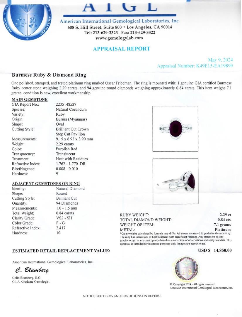 One polished. stamped. and tested platinum ring marked Oscar Friedman. The ring is mounted with: 1 genuine GIA certified Burmese Ruby center stone weighing 2.29 carats, and 94 genuine round diamonds weighing approximately 0.84 carats. This item weighs 7.1 grams, condition is new, excellent workmanship. #MAIN GEMSTONE# GIA Report No.: 2235148537 Species: Natural Corundum Variety: Ruby Origin: Burma (Myanmar) Shape: Oval Cutting Style: Brilliant Cut Crown, Step Cut Pavilion Measurements: 9.15 x 6.93 x 3.90mm Weight: 2.29 carats Color: Purplish Red Transparency: Translucent Treatment: Heat with Residues Refractive Index: 1.762 - 1.770 DR Birefringence: 0.008 - 0.010 Hardness: 9 #ADJACENT GEMSTONES ON RING# Identity: Natural Diamond Shape: Round Cutting Style: Brilliant Cut Quantity: 94 Diamonds Measurements: 1.0- 1.5mm Total Weight: 0.84 carats Clarity Grade: VS2-SI1 Color Grade: F-G Refractive Index: 2.417 Hardness: 10 RUBY WEIGHT: 2.29ct TOTAL DIAMOND WEIGHT: 0.84 cts WEIGHT OF ITEM: 7.1 grams METAL: Platinum Size: 6 3/4