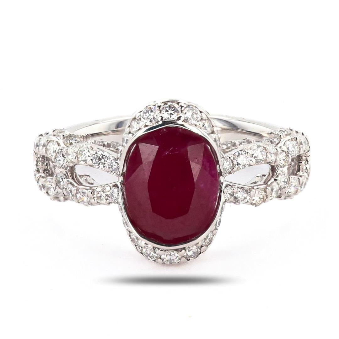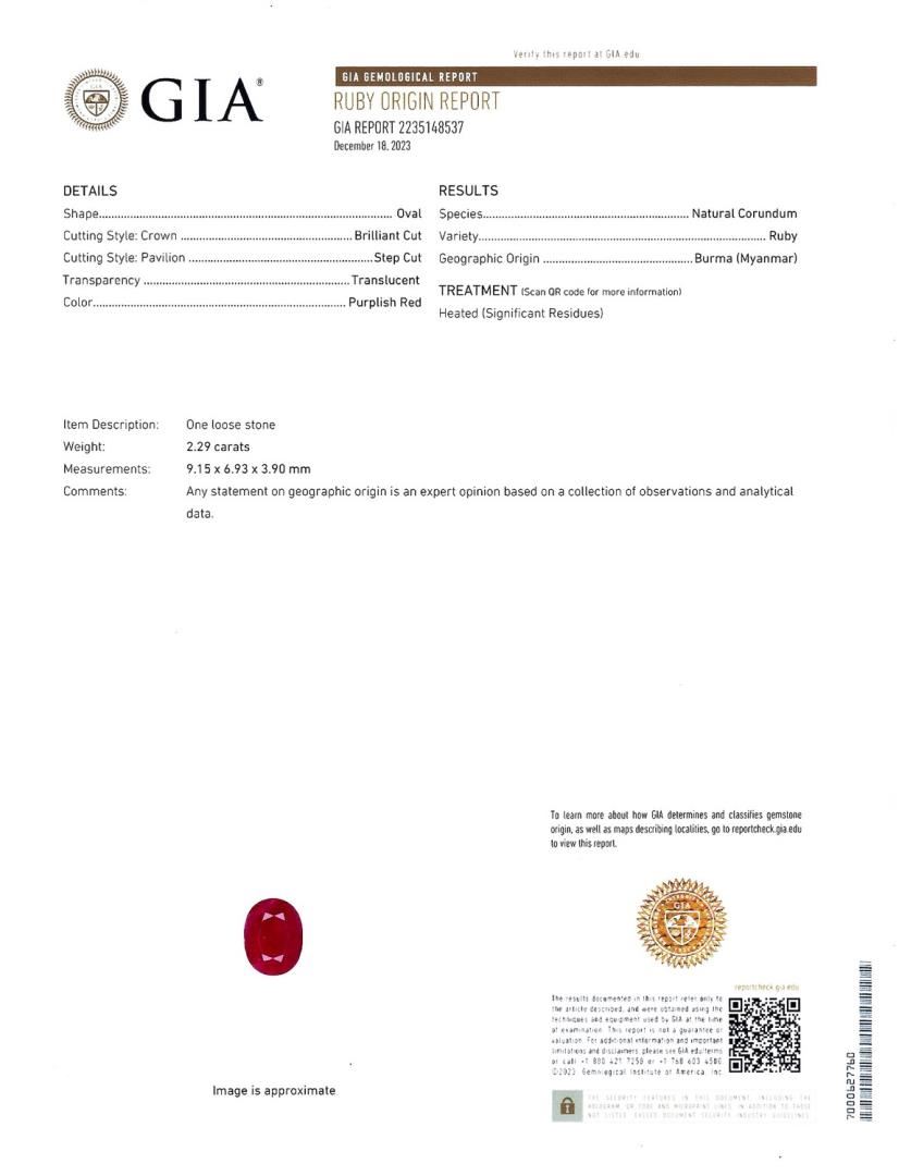 One polished. stamped. and tested platinum ring marked Oscar Friedman. The ring is mounted with: 1 genuine GIA certified Burmese Ruby center stone weighing 2.29 carats, and 94 genuine round diamonds weighing approximately 0.84 carats. This item weighs 7.1 grams, condition is new, excellent workmanship. #MAIN GEMSTONE# GIA Report No.: 2235148537 Species: Natural Corundum Variety: Ruby Origin: Burma (Myanmar) Shape: Oval Cutting Style: Brilliant Cut Crown, Step Cut Pavilion Measurements: 9.15 x 6.93 x 3.90mm Weight: 2.29 carats Color: Purplish Red Transparency: Translucent Treatment: Heat with Residues Refractive Index: 1.762 - 1.770 DR Birefringence: 0.008 - 0.010 Hardness: 9 #ADJACENT GEMSTONES ON RING# Identity: Natural Diamond Shape: Round Cutting Style: Brilliant Cut Quantity: 94 Diamonds Measurements: 1.0- 1.5mm Total Weight: 0.84 carats Clarity Grade: VS2-SI1 Color Grade: F-G Refractive Index: 2.417 Hardness: 10 RUBY WEIGHT: 2.29ct TOTAL DIAMOND WEIGHT: 0.84 cts WEIGHT OF ITEM: 7.1 grams METAL: Platinum Size: 6 3/4