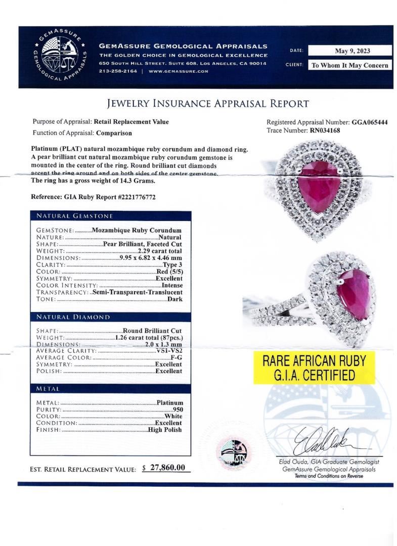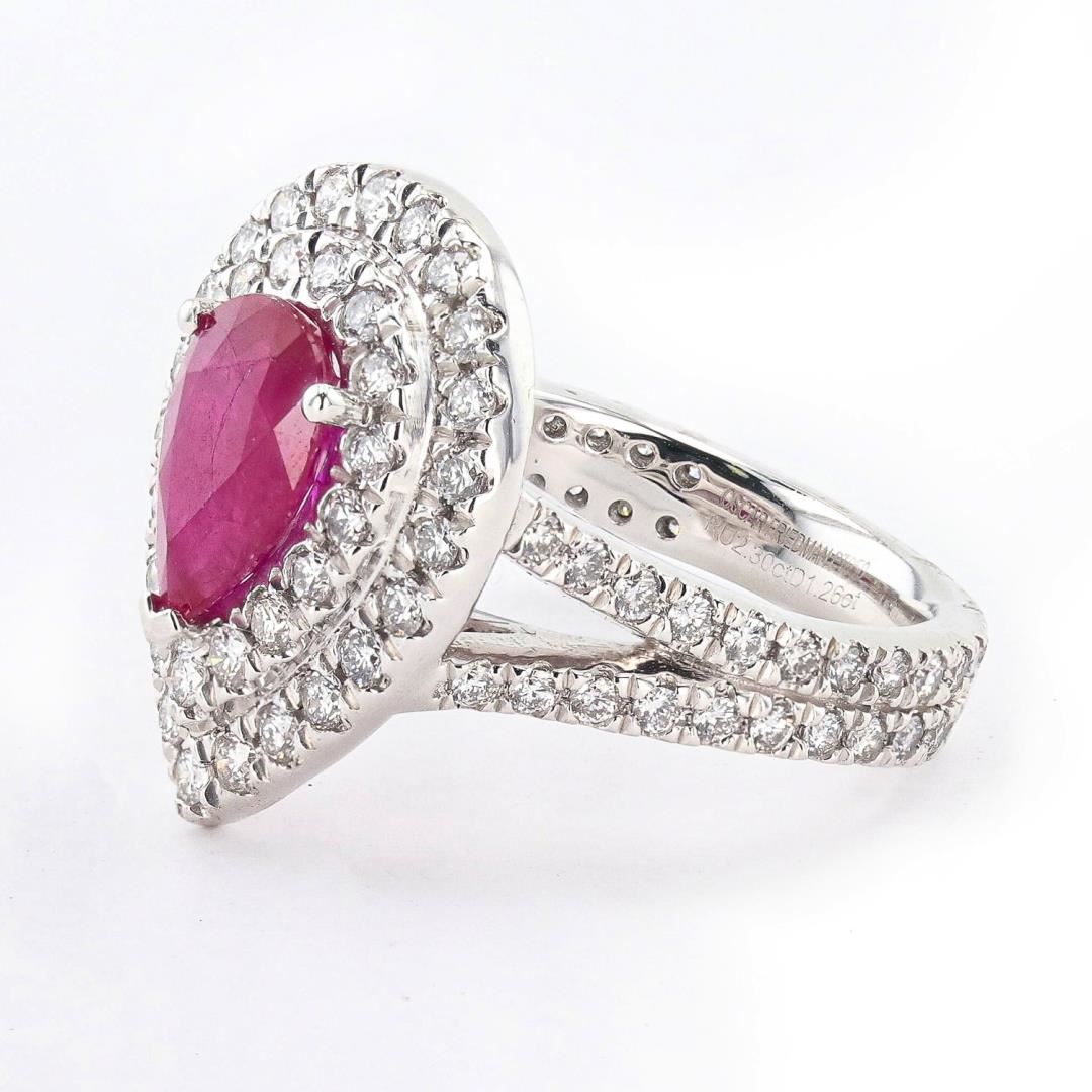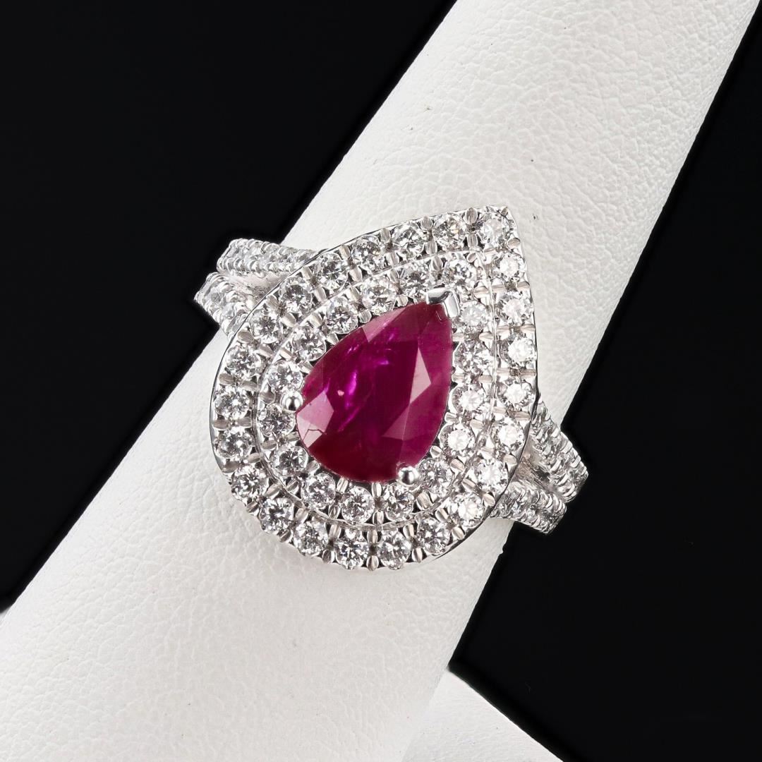 Platinum (PLAT) natural mozambique ruby corundum and diamond ring. A pear brilliant cut natural mozambique ruby corundum gemstone is mounted in the center of the ring. Round brilliant cut diamonds accent the ring around and on both sides of the center gem
