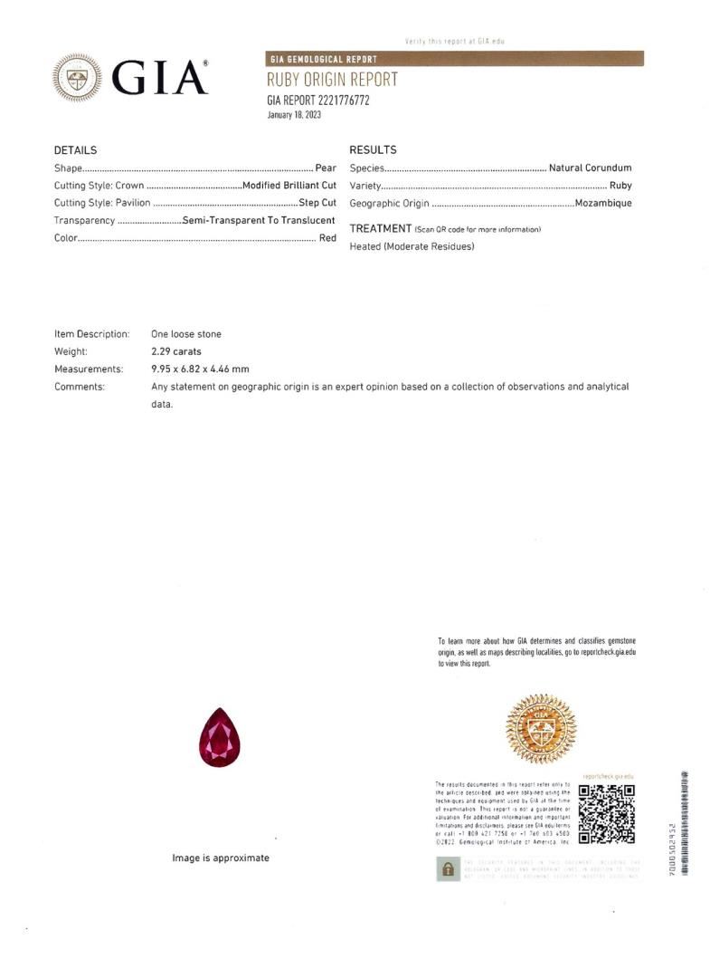 Platinum (PLAT) natural mozambique ruby corundum and diamond ring. A pear brilliant cut natural mozambique ruby corundum gemstone is mounted in the center of the ring. Round brilliant cut diamonds accent the ring around and on both sides of the center gemstone. The ring has a gross weight of 14.3 Grams. Reference: GIA Ruby Report 2221776772 #NATURAL GEMSTONE# GEMSTONE: Mozambique Ruby Corundum NATURE: Natural SHAPE: Pear Brilliant, Faceted Cut WEIGHT: 2.29 carat total DIMENSIONS: 9.95 x 6.82 x 4.46mm CLARITY: Type 3 COLOR: Red (5/5) SYMMETRY: Excellent COLOR INTENSITY: Intense TRANSPARENCY: Semi-Transparent-Translucent TONE: Dark #NATURAL DIAMOND# SHAPE: Round Brilliant Cut WEIGHT: 1.26 carat total (87pcs.) DIMENSIONS: 2.0 x 1.3mm AVERAGE CLARITY: VS1-VS2 AVERAGE COLOR: F-G SYMMETRY: Excellent POLISH: Excellent #METAL# METAL: Platinum PURITY: 950 COLOR: White CONDITION: Excellent FINISH: High Polish #LREF-7468